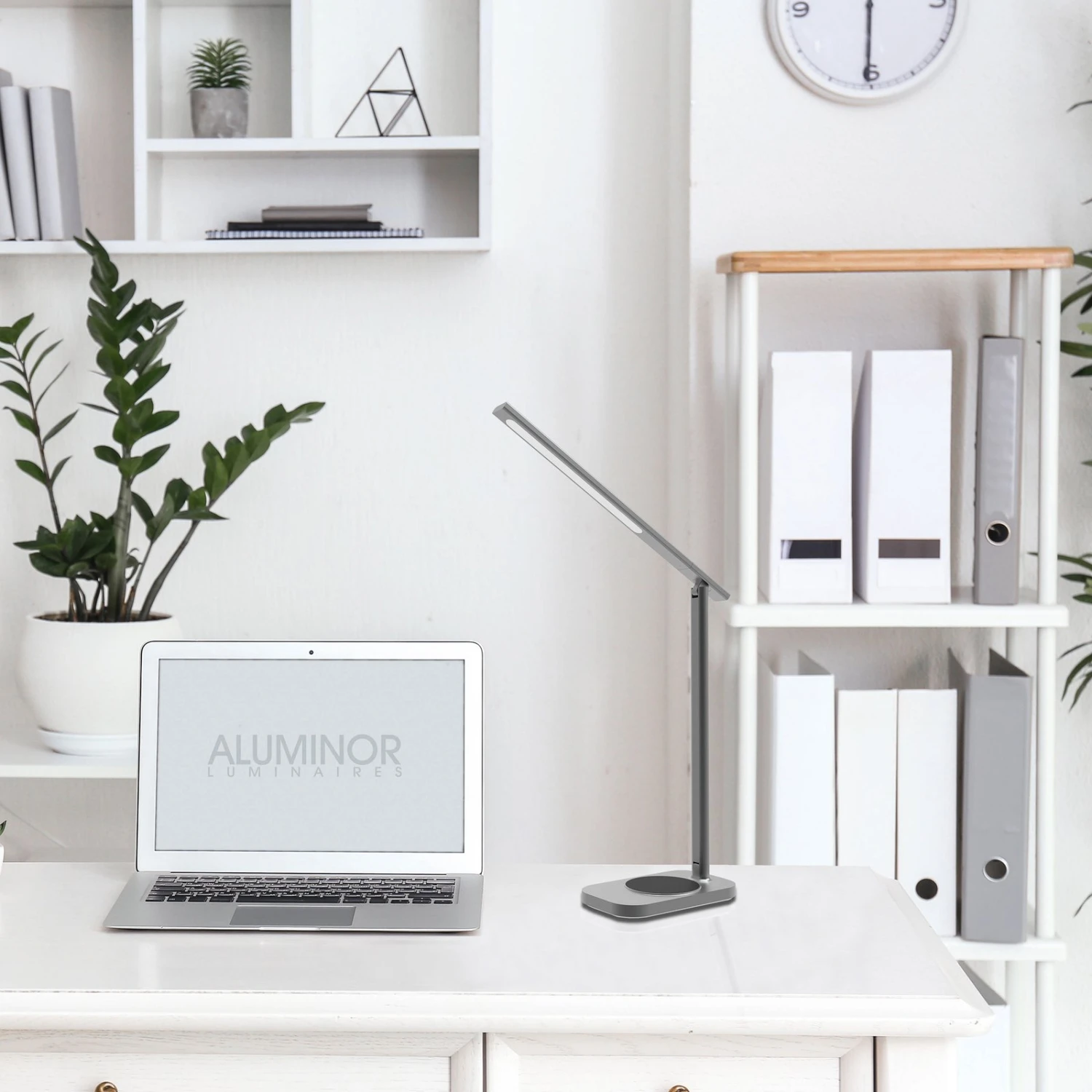 Über USB-Anschluss aufladbare LED-Schreibtischleuchte Luna mit Induktionsfläche Die LED-Schreibtischleuchte Luna zeigt sich dank ihres schlanken, dezenten Designs als eine in viele Einrichtungsstile integrierbare Lichtquelle. Es sind leistungsstarke LEDs verbaut, die für eine homogene Arbeitsplatzbeleuchtung sorgen. Lichthelligkeit und Farbtemperatur können stufenlos eingestellt und so – den jeweiligen Anforderungen entsprechend – angepasst werden. Der Fuß ist mit einer Induktionsfläche bestückt, sodass ein kompatibles Smartphone durch simples Auflegen wieder aufgeladen werden kann. Luna ist mit einem integrierten USB-Port sowie einem Kabel mit Steckernetzteil für die Aufladung an der Stromquelle ausgestattet. – Reflektor seitlich kippbar – höhenverstellbar (10-42 cm)