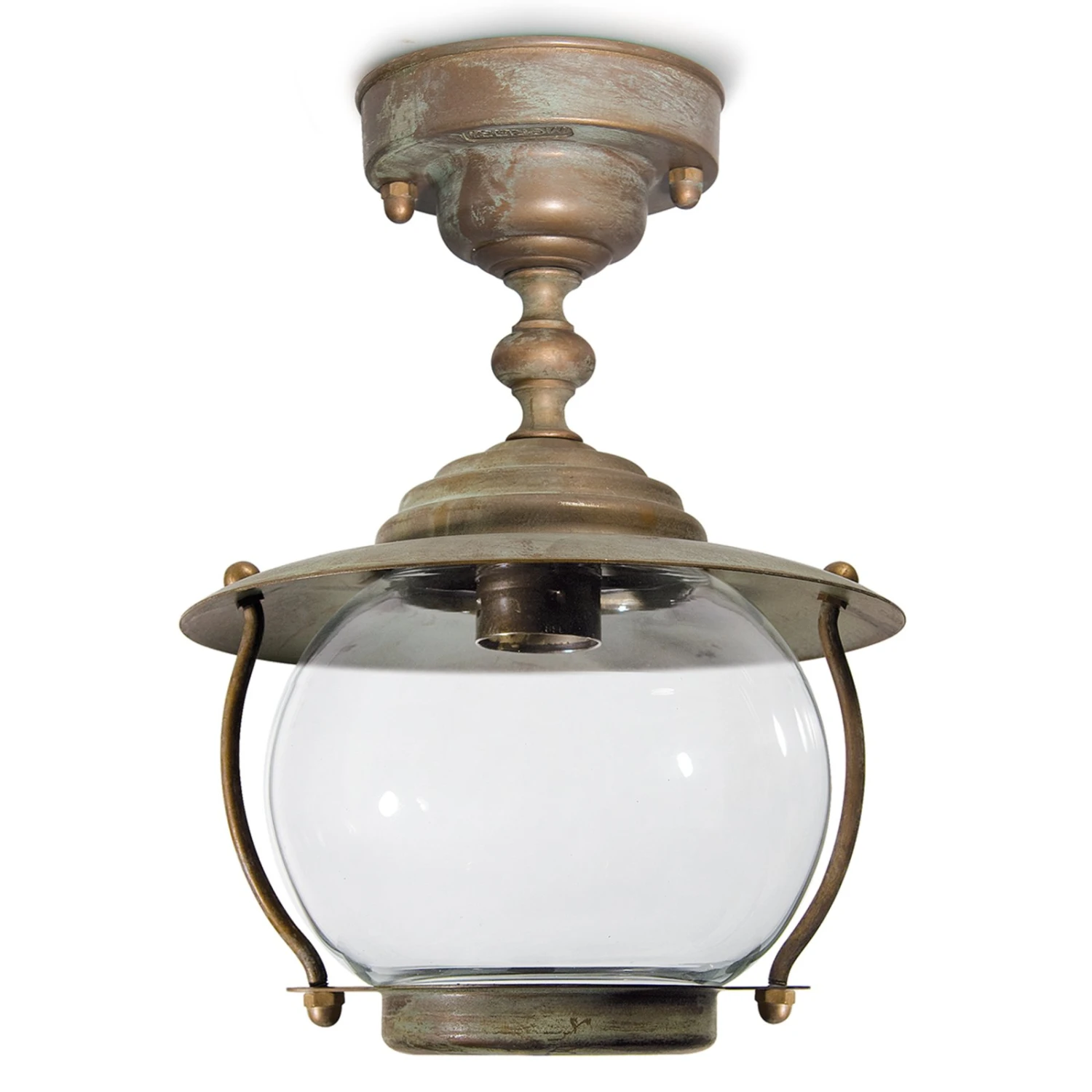 Die Deckenleuchte Olivia begeistert nicht nur mit ihrem antiken Aussehen, sondern auch mit ihrer bezaubernden Lichtwirkung. Sie besitzt einen robusten Messingkörper, in dem sich ein kugelrunder Glasschirm befindet. Dieser lässt das Licht wunderbar zu allen Seiten abstrahlen, wodurch der Außenbereich optimal erhellt wird. Des Weiteren beeindruckt sie mit ihrer antikisierten Messingoberfläche, die in Zusammenspiel mit der runden Form eine wunderbar verspielte wie auch mediterrane Wirkung erzielt. Dadurch, dass die Leuchte seewasserfest ist, kann sie bedenkenlos in Meeresnähe genutzt werden.