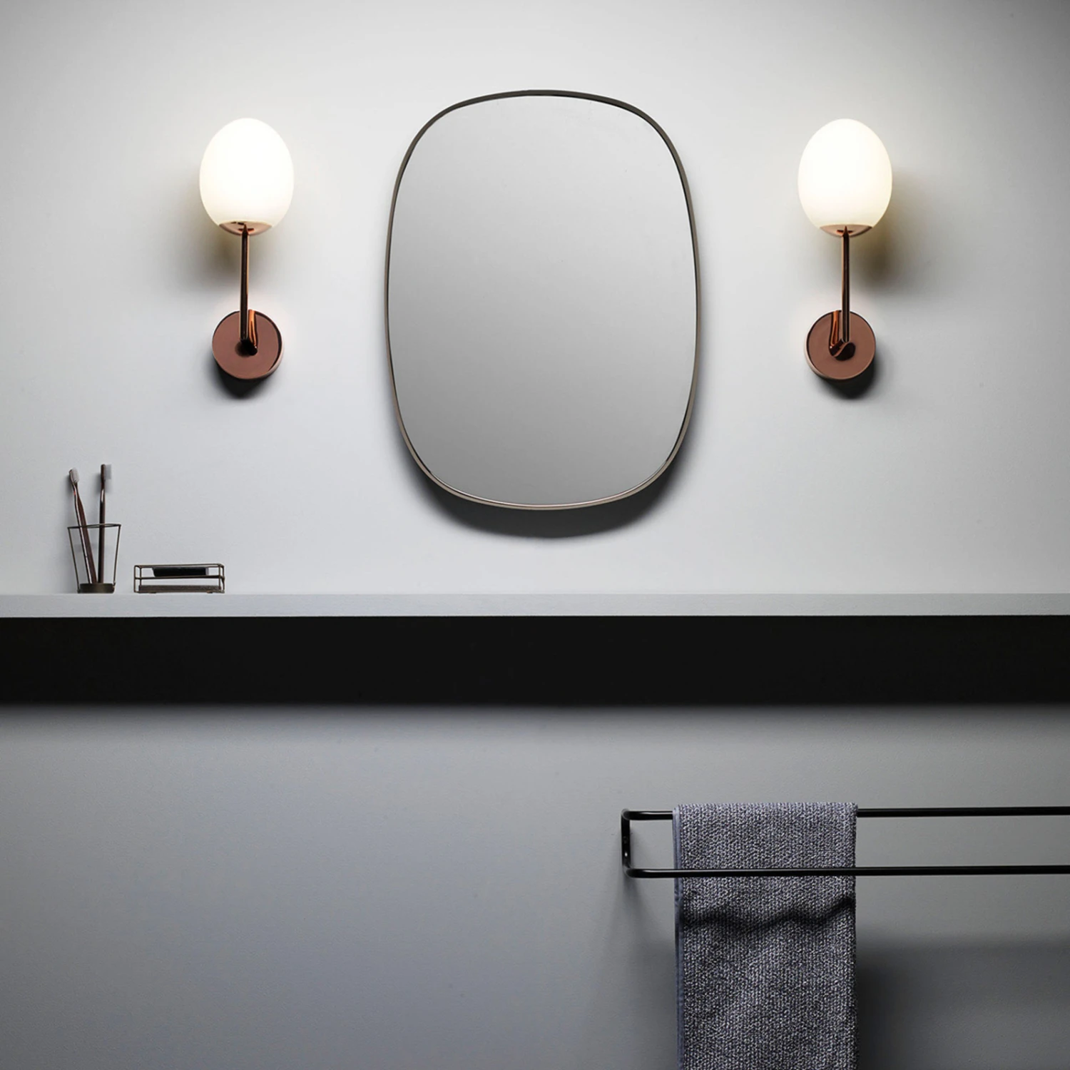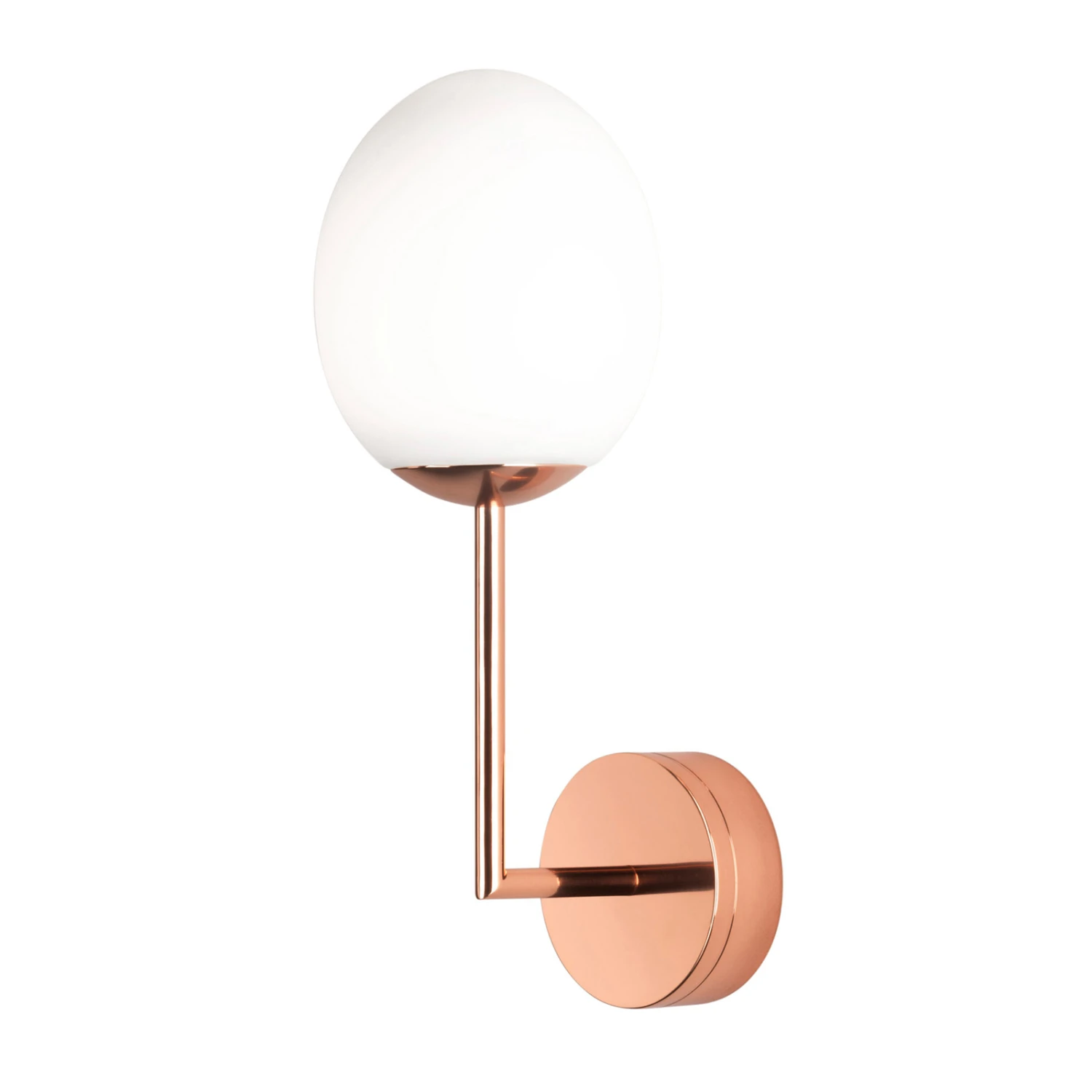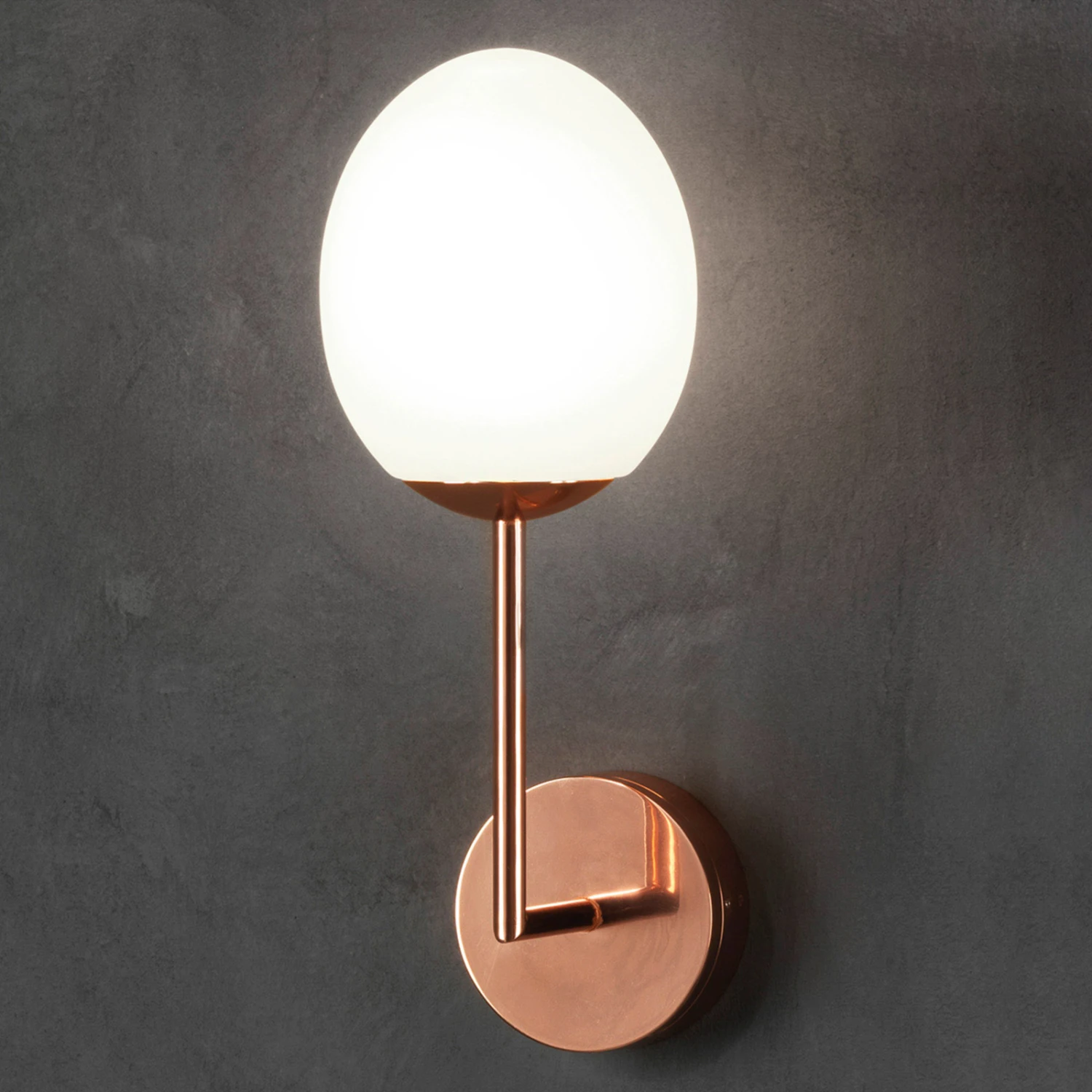Besonders elegant wirkt die Wandleuchte Kiwi, deren Leuchtenschirm aus einer opalweißen Glaskugel besteht. Diese enthält fest verbaute LEDs, die den Raum blendfrei beleuchten. Die Leuchte wirkt sehr anmutig, da die Glaskugel von einem rechtwinklig gebogenen Metallstab gehalten wird. Stab und Wandhalterung glänzen mit einem Finish in Kupfer poliert. Dank IP44-Schutz ist diese schöne Leuchte auch für die Anbringung im Badezimmer geeignet.