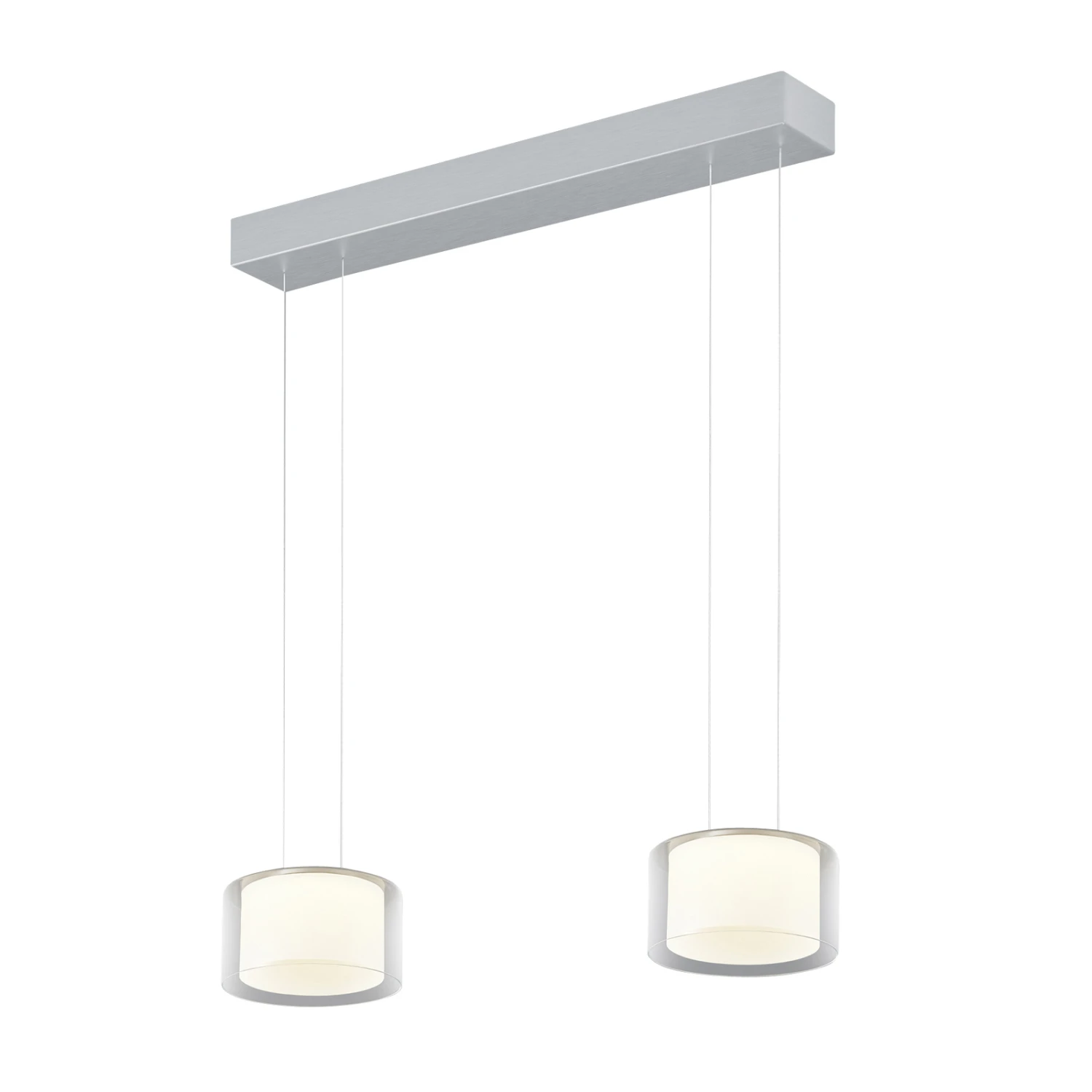 Bei der zweiflammigen LED-Hängeleuchte Grand Clear werden die aus Glas gefertigten Schirme von dem aus eloxiertem Aluminium bestehenden Baldachin in Balkenform über je zwei Seile abgelassen. Die Abhängung kann hierbei dank magnetischer Befestigungen jeweils flexibel im Betrieb eingestellt werden. Die äußere Hülle der Schirme ist klar, wohingegen innen ein opalweißer Diffusor seitlich für eine leicht diffuse Lichtabgabe sorgt.