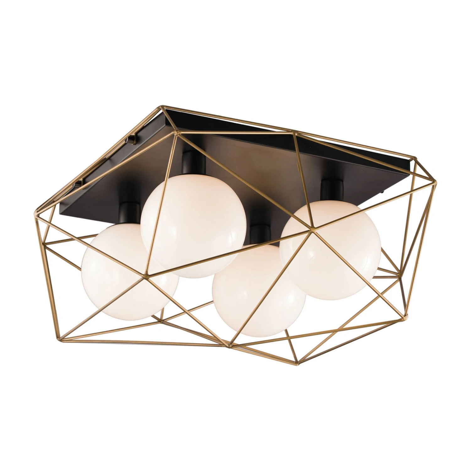 Auf einer quadratischen, schwarzen Deckenplatte finden vier matt-weiße Kugeln ihren Platz. Umringt sind diese durch ein goldfarbenes Metallgerüst, das einen wunderschönen Kontrast zu den opalen Leuchtkugeln und der dunklen Platte generiert. Das Licht fällt hier besonders weich und homogen nach unten in den Raum und bietet eine gute Allgemeinbeleuchtung.