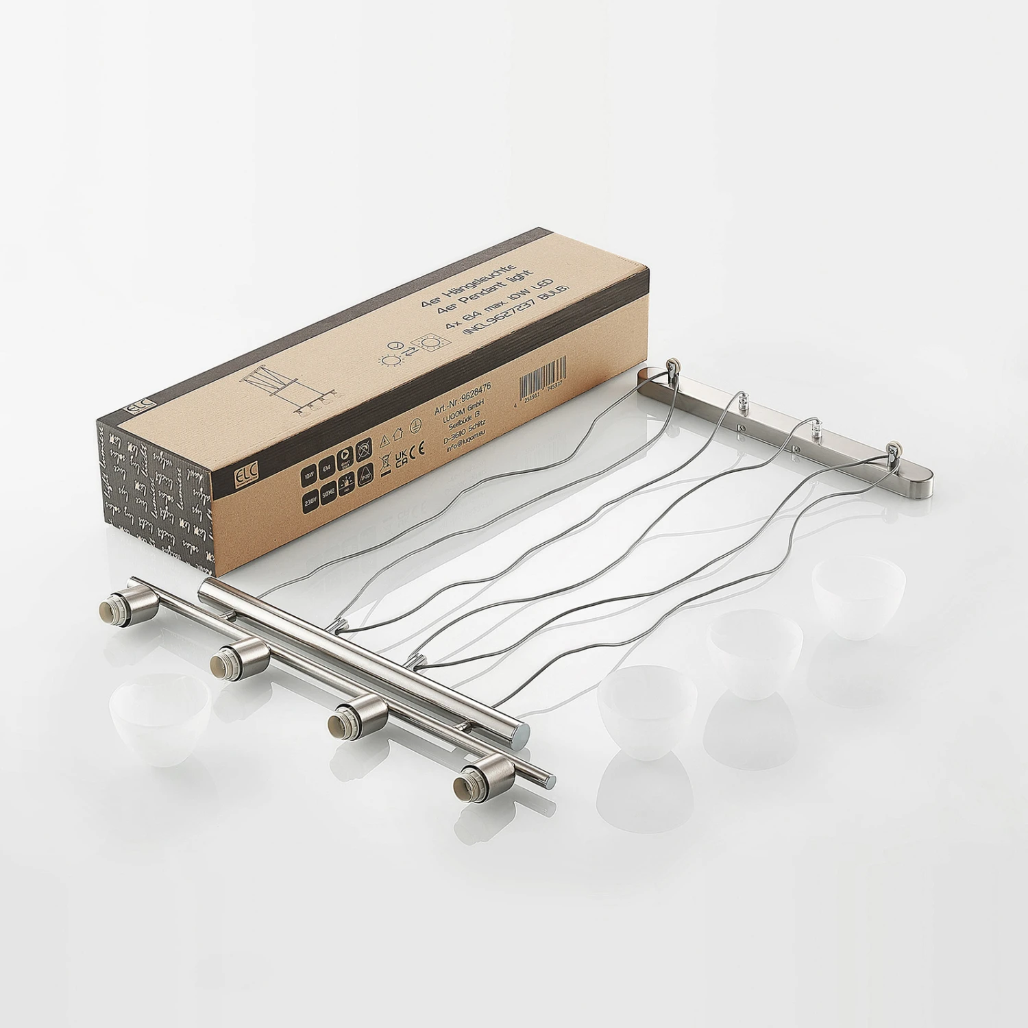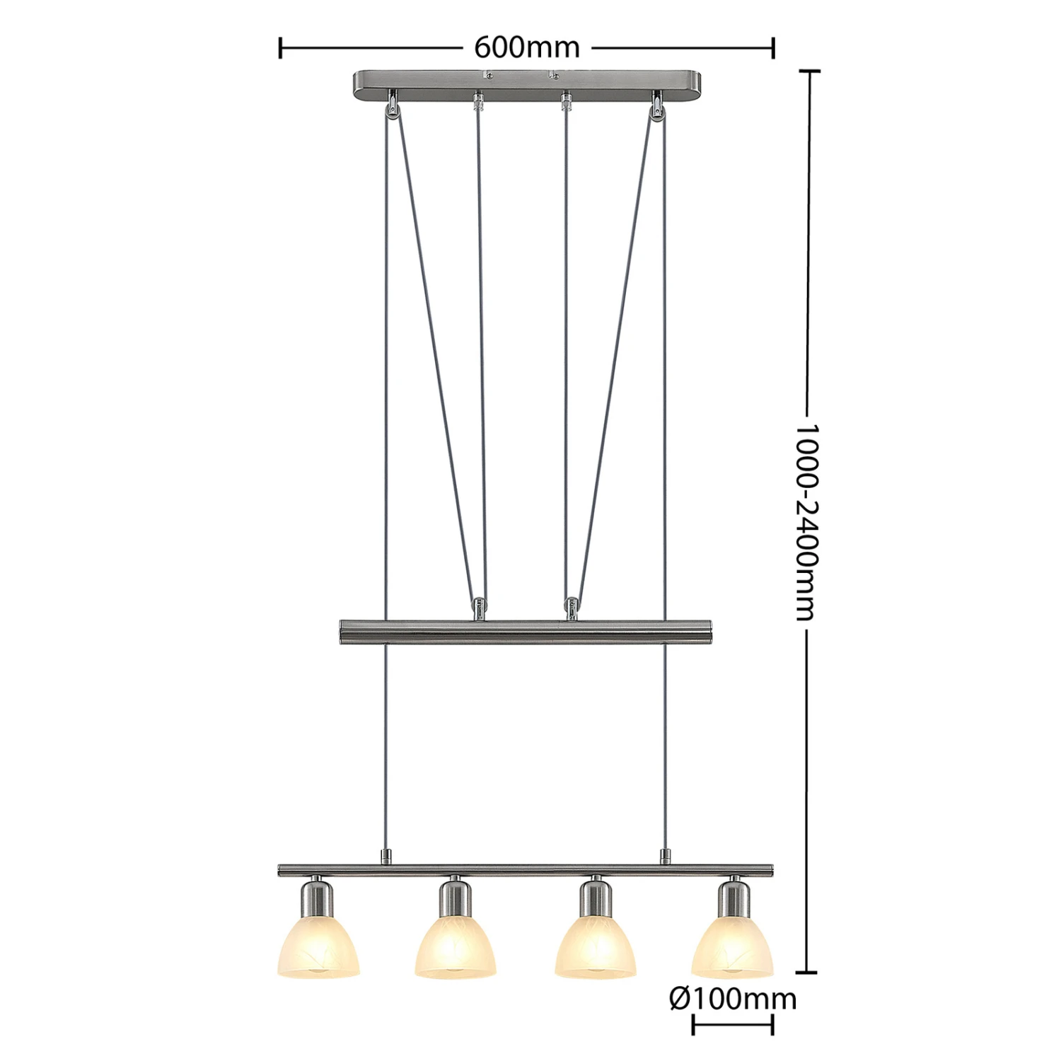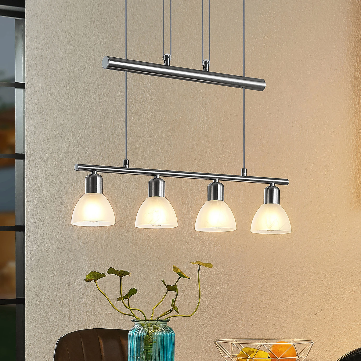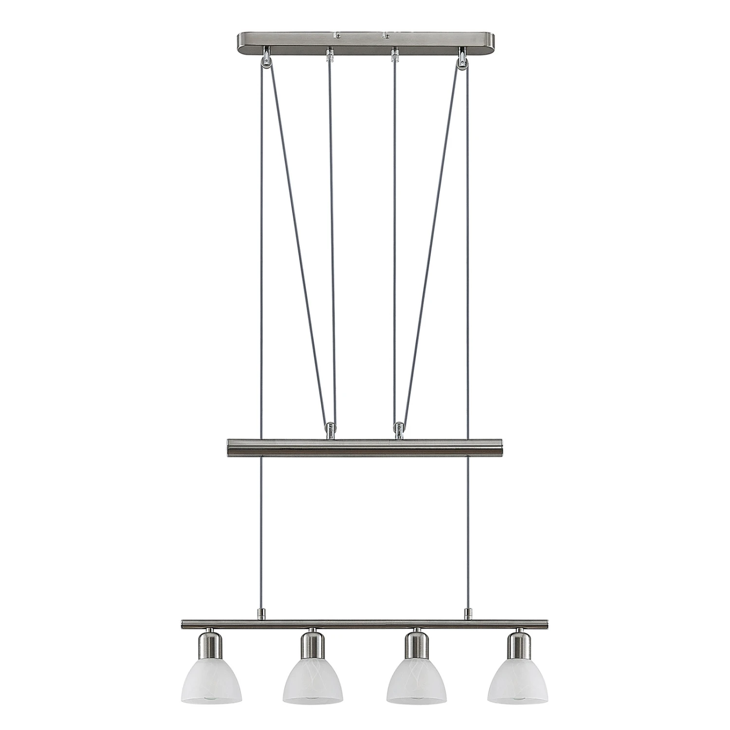 Die LED-Balkenpendelleuchte Javari ist eine echte Bereicherung für den Wohnbereich, denn sie sorgt für eine gleichmäßige Beleuchtung und lässt sich außerdem mit wenigen Handgriffen von 100 cm bis zu 240 cm in der Höhe verstellen. Somit eignet sie sich optimal als Beleuchtungsobjekt über dem Esszimmertisch oder auch über einer Küchentheke. Das nickelfarbene Gehäuse und die hellen Leuchtenschirme aus Alabasterglas lassen sich mühelos in unterschiedliche Farbkonzepte integrieren. Die vier Leuchtenschirme können mit E14-Leuchtmitteln bestückt werden.