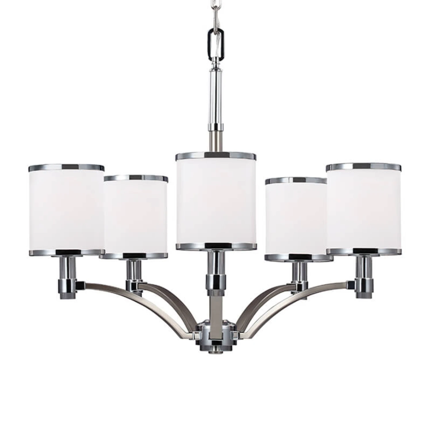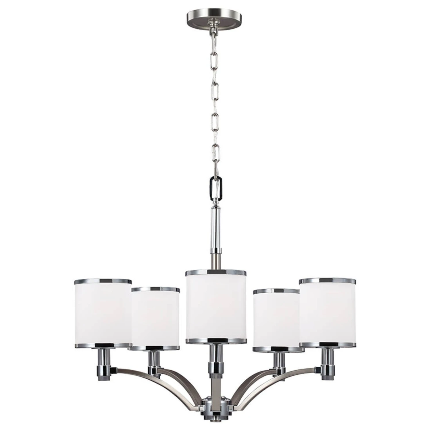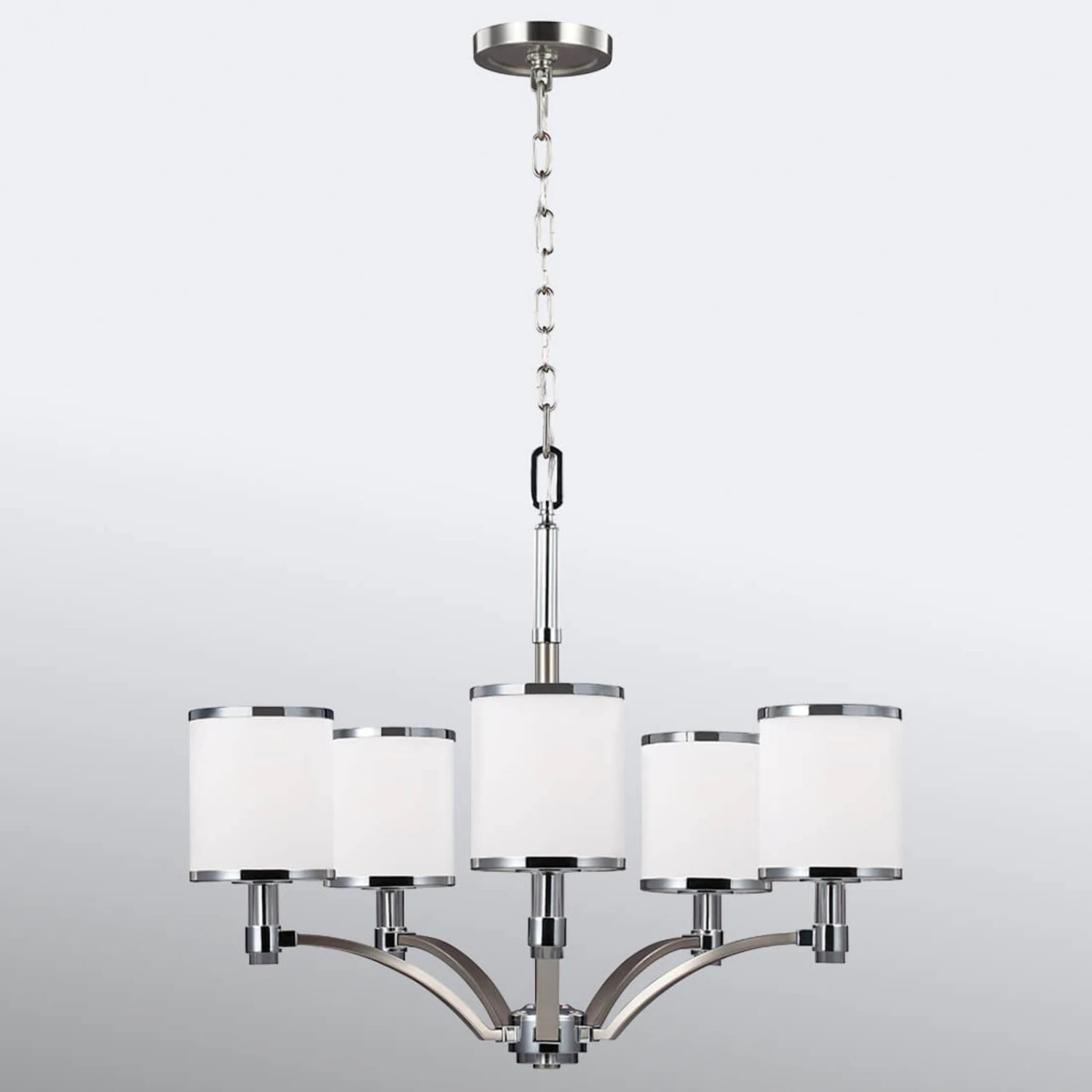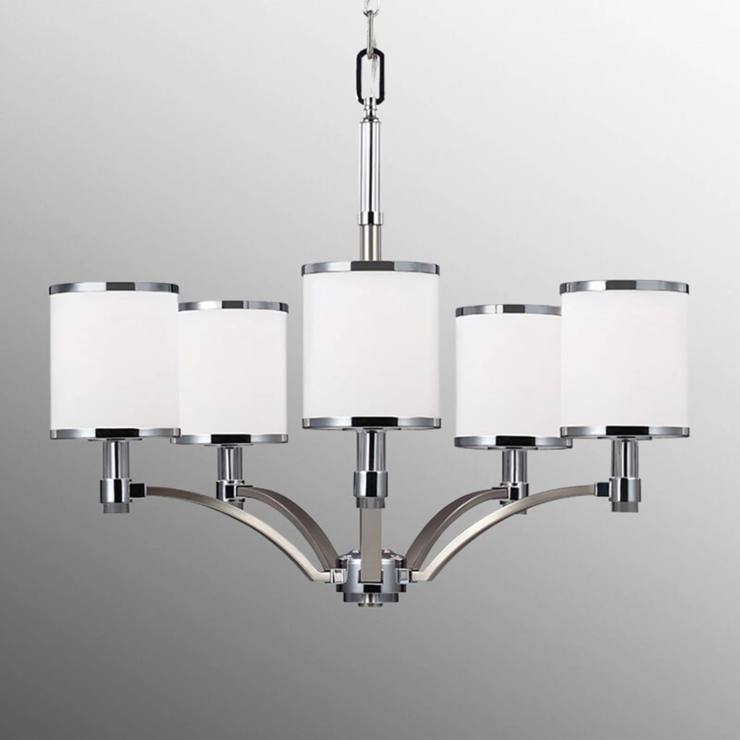 Das Design des fünfflammigen Kronleuchters Prospect Park trägt traditionelle Züge mit modernen Aspekten, was seiner kompletten Erscheinung sehr viel Ausdruck verleiht und ihn zu einem stilvollen Accessoire eines eleganten Wohnstils macht. Das klar strukturierte Gestell wurde mit einem satinierten Nickel-Finish bearbeitet, verchromte Elemente betonen die elegante Silhouette und jeder der zylindrischen Schirme aus geätztem Opalglas ist sowohl oben als auch unten mit einem akzentuierenden Metallband eingefasst, was sehr glamourös wirkt.