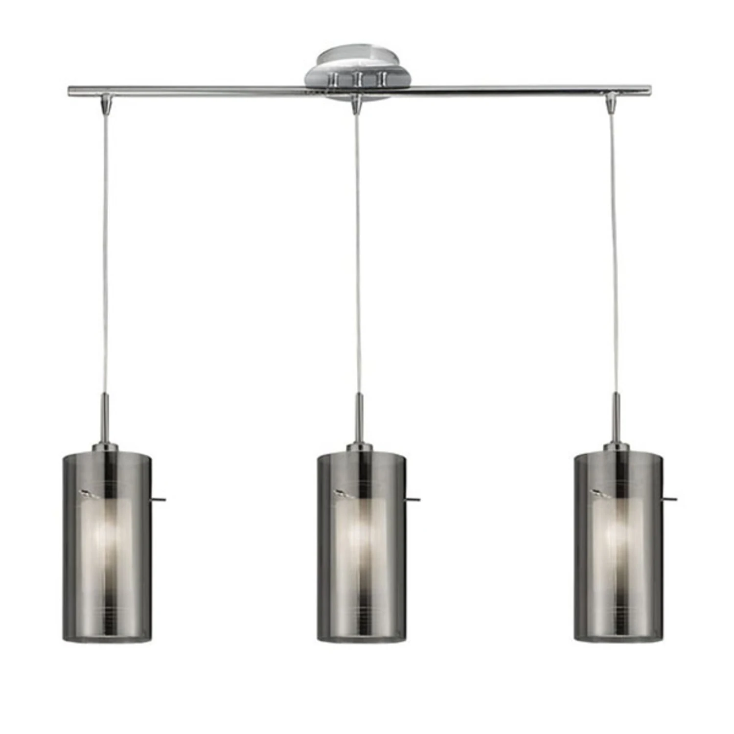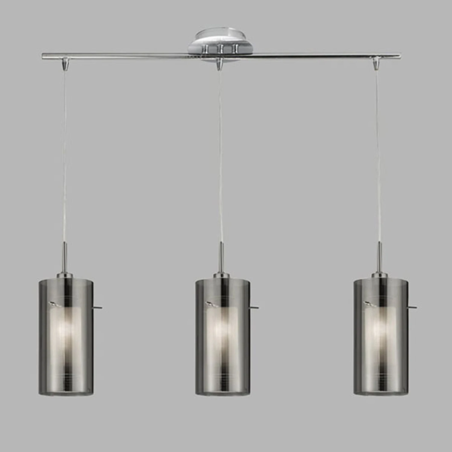Die dreiflammige Hängeleuchte Duo 2 ist ideal für Esszimmer oder Küche. Licht kommt hier von drei doppelten Glaszylindern, die innen aus Milchglas und außen mit modernem Rauchglas versehen sind. Das Rauchglas wird hier optisch perfekt ergänzt mit der chrom-glänzenden Leiste, an der die Glaszylinder befestigt sind. Ob Küchentheke oder Esszimmertisch – die Hängeleuchte Duo 2 bietet ein angenehmes Licht, gepaart mit einem stilvollen Design.