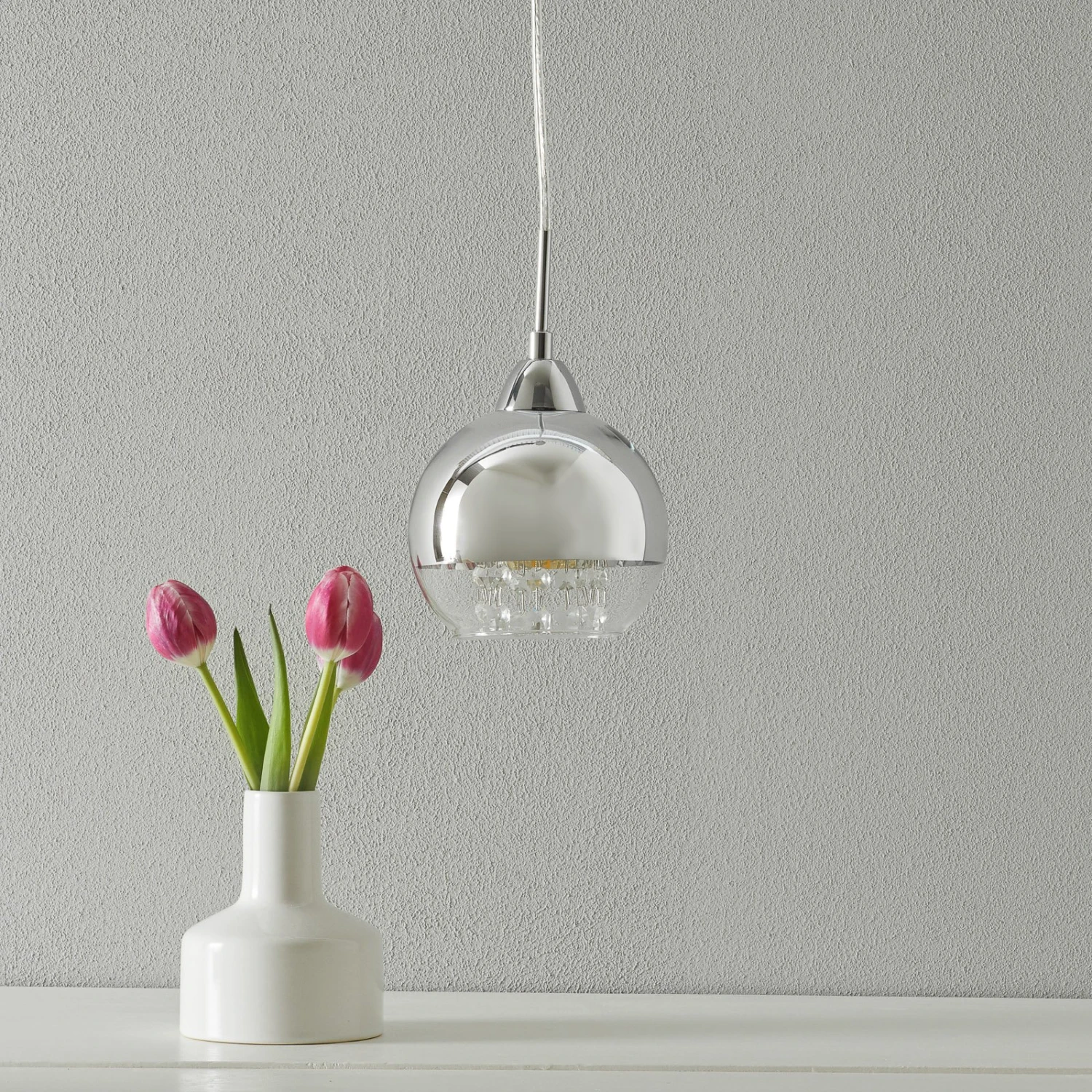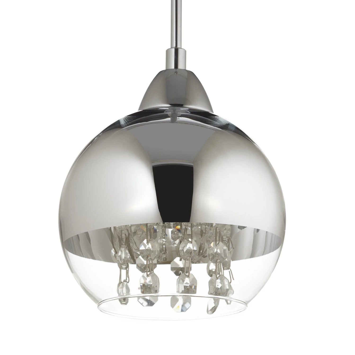 Die elegante Hängeleuchte Iceberg begeistert dank wundervoller Optik und glänzenden Kristallen. Der kugelförmige Lampenschirm besteht aus Glas, wobei eine Hälfte in Nickel gehalten ist, während die andere Hälfte klassisch transparent ist. Dadurch sind die Kristall-Ketten im Inneren des Schirms gut sichtbar. Diese verleihen der Leuchte eine edle und hochwertige Optik. Zusätzlich reflektieren die Kristalle das Licht und sorgen für zauberhafte Lichtmomente.