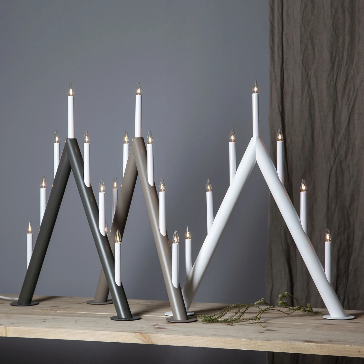 Geradezu puristisch könnte man das Design des aus Holz gefertigten Kerzenleuchters Circum nennen. Das Holzgestell ist nach oben spitz gewinkelt, die sieben Kerzenleuchten sind gleichmäßig verteilt. Es ist gerade diese Schlichtheit, die Circum zu einem besonderen Hingucker macht. Der Schalter ist in das Zuleitungskabel integriert.