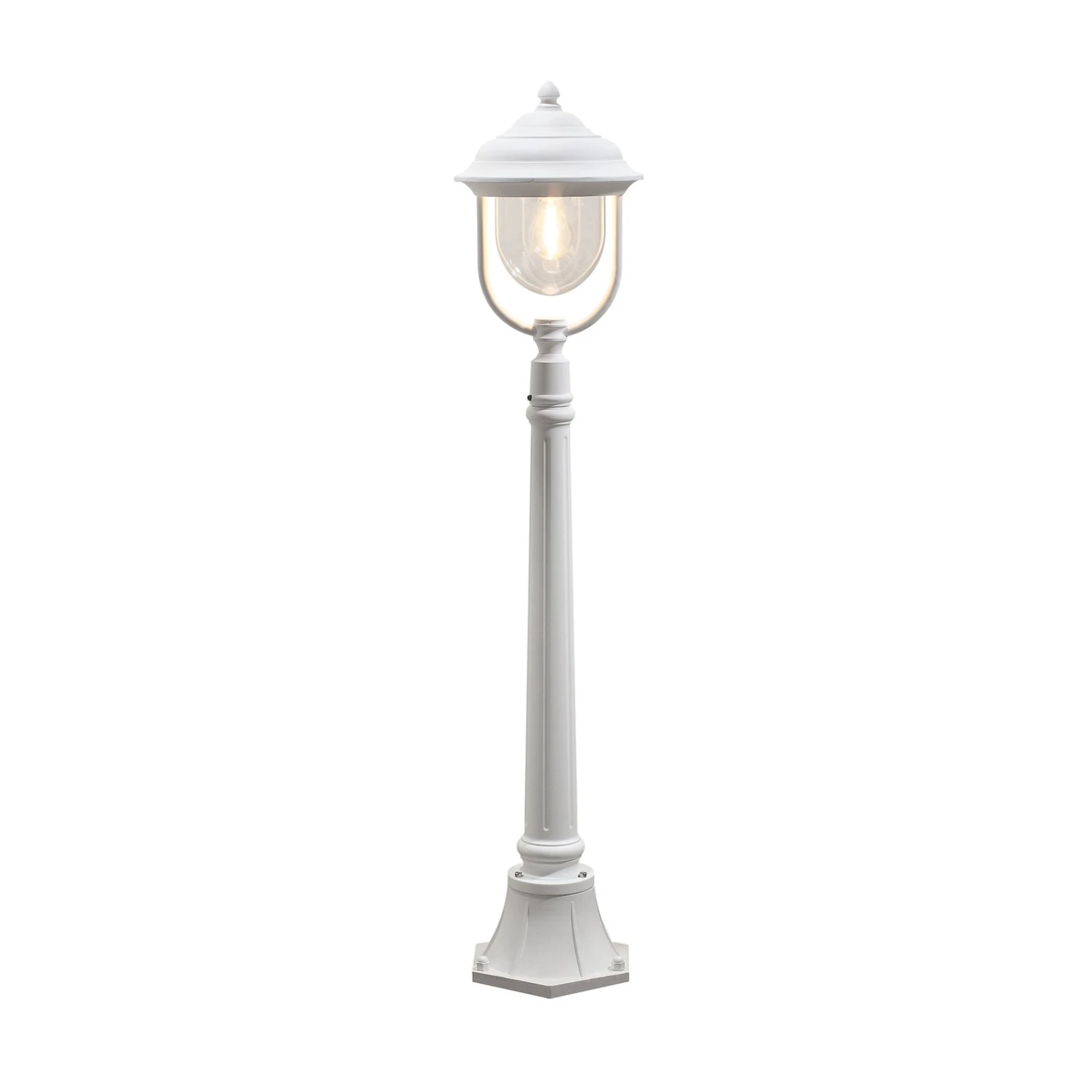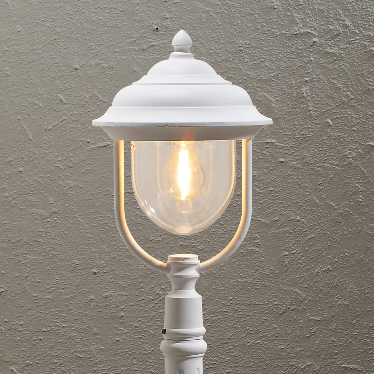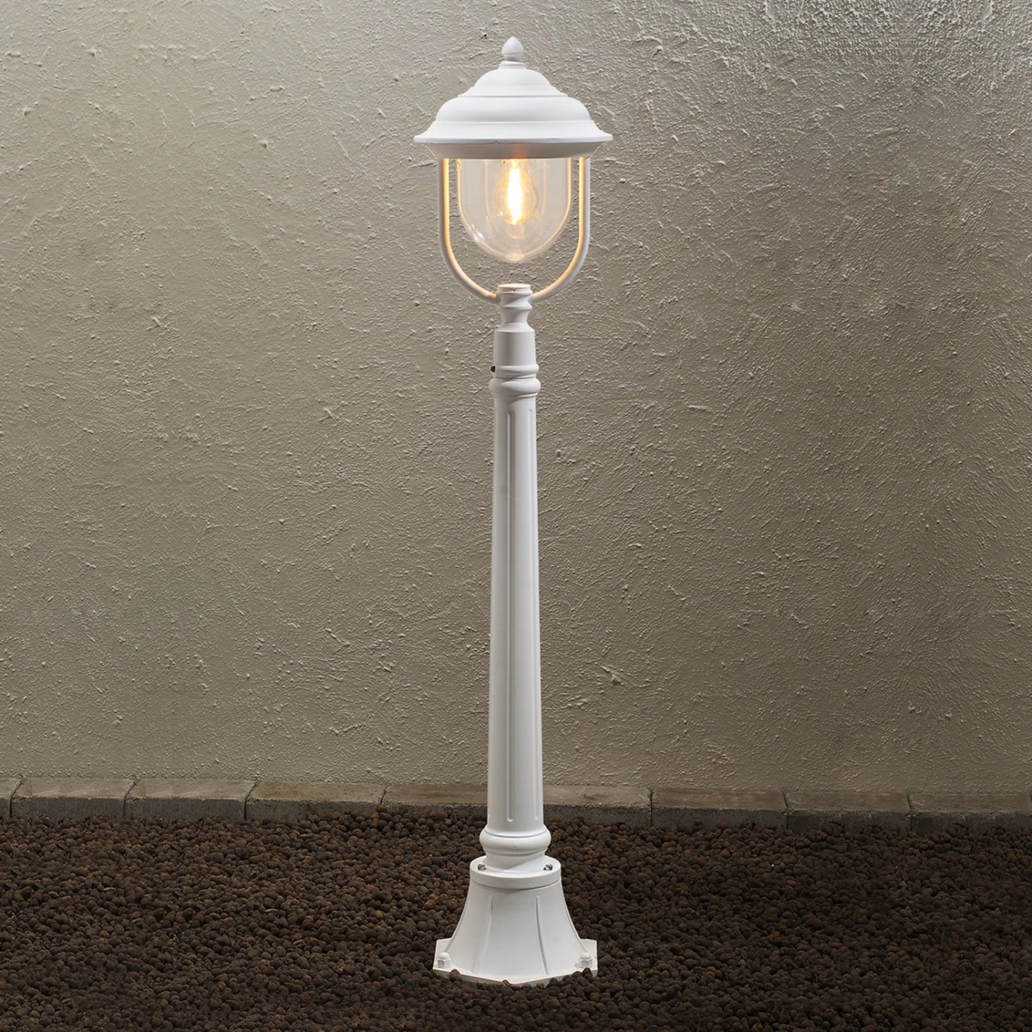 Klassische, aus Aluminium gefertigte Wegeleuchte Parma. Das klare Leuchtenglas garantiert eine optimale Ausleuchtung. Der schön geformte Schirm und die Verzierungen an Leuchte und Mast verleihen der Leuchte eine leicht nostalgische Wirkung.