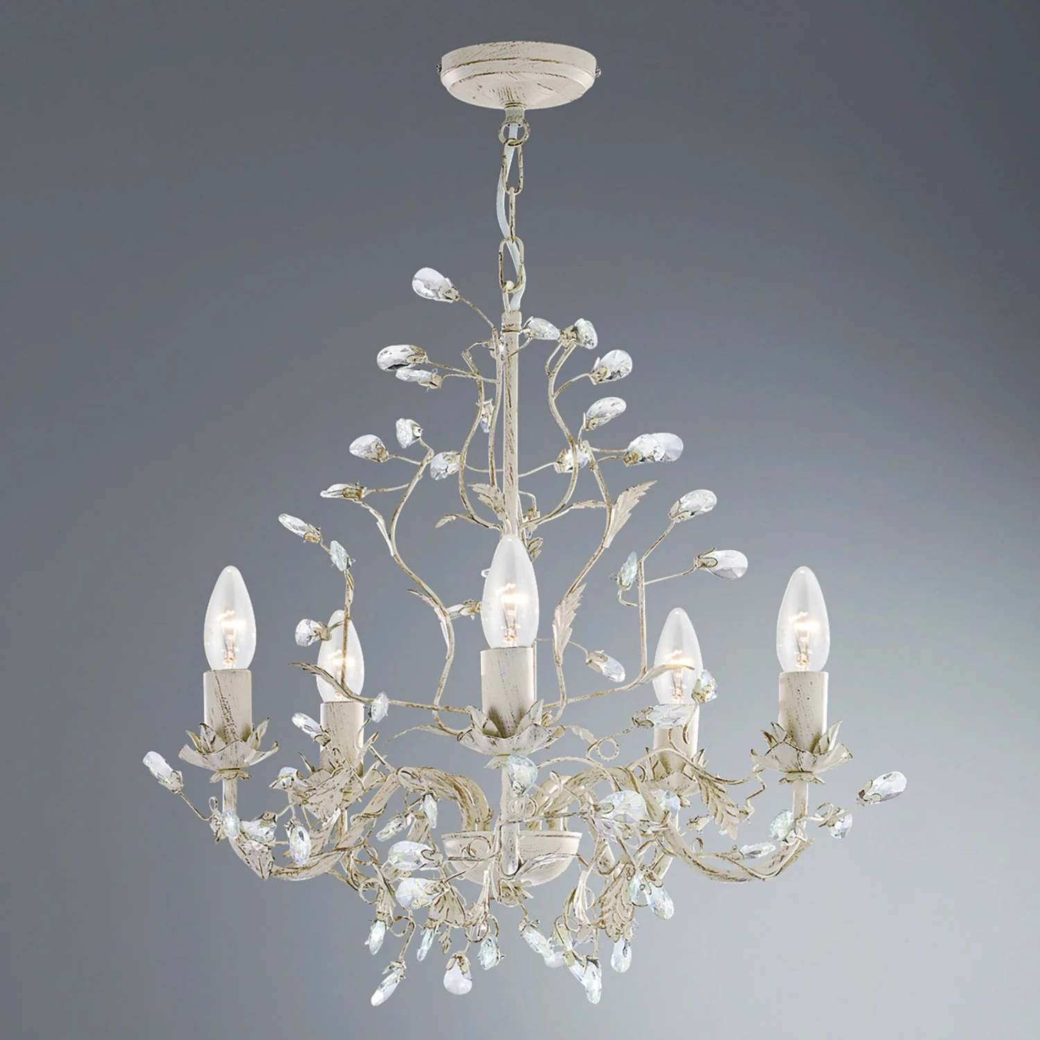 Mit filigranen Ästen, Blattverzierungen und schmückenden Glaselementen wurde der Kronleuchter Almandite im Florentiner Stil gestaltet. Die zarte Farbgebung in Creme und Gold komplettiert die edle und filigrane Erscheinung dieser edlen Lichtquelle, die sich in vielen Einrichtungsstilen als Hauptlichtquelle im Esszimmer oder auch im Wohnzimmer oder im Flur anbringen lässt. Fünf E14-Fassungen in hellen, dekorativen Kerzenschäften aus Metall lassen sich mit Kerzenlampen bestücken, wobei klare Varianten besonders dekorativ wirken. Leuchtmittel werden nicht mitgeliefert – passende Leuchtmittel können aber direkt unter dem Button Leuchtmittel wählen ausgewählt und direkt mitbestellt werden.