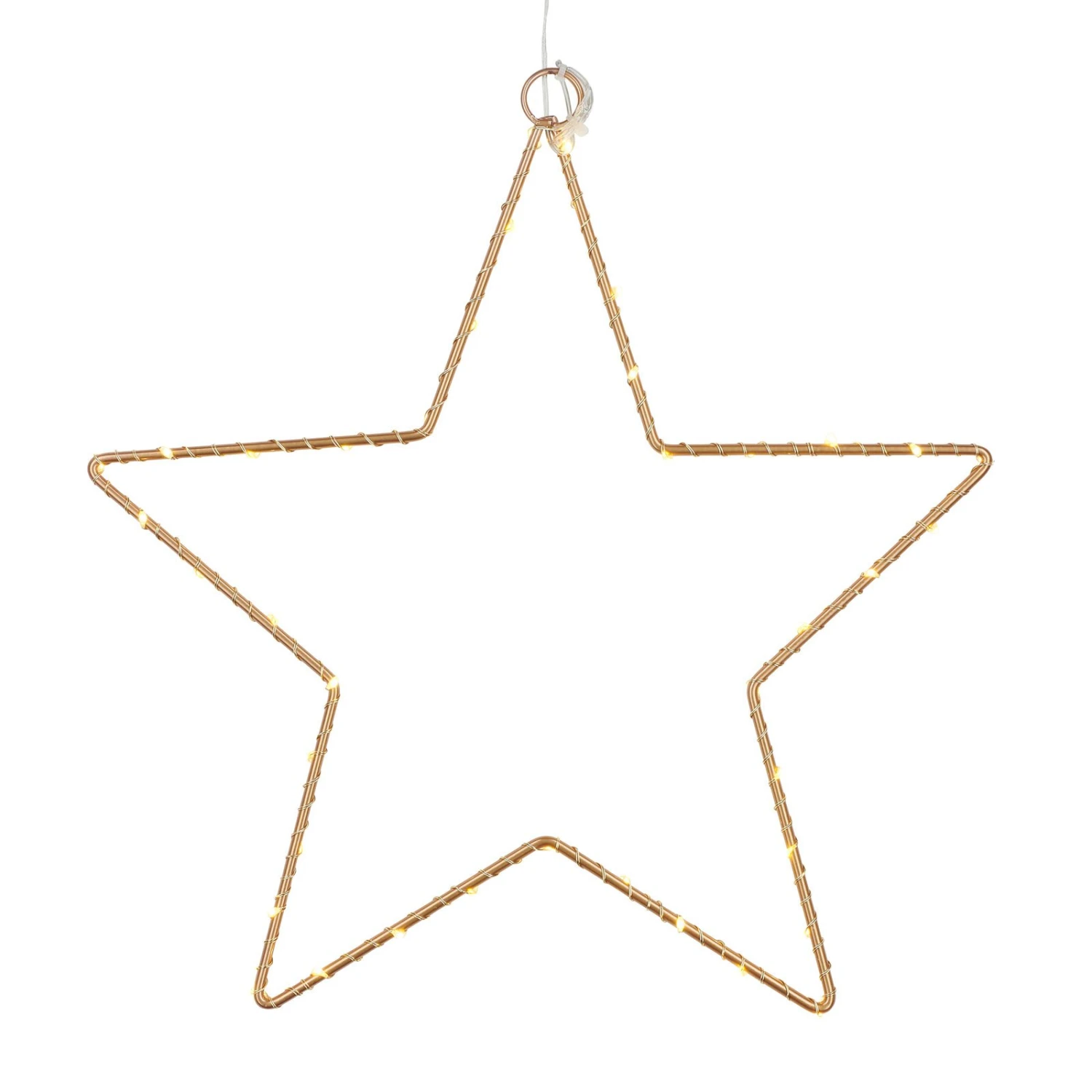 Liva Star ist eine vielseitig einsetzbare Lichtdekoration für den Innenbereich und trägt zu einem weihnachtlichen Ambiente bei. Sie besteht aus einem goldfarbenen sternenförmigen Gestell, das mit 40 LEDs besetzt ist. Zur Stromversorgung werden zwei AAA-Batterien benötigt (siehe Zubehör), die in einem dekorativen metallischen Halter Platz finden.