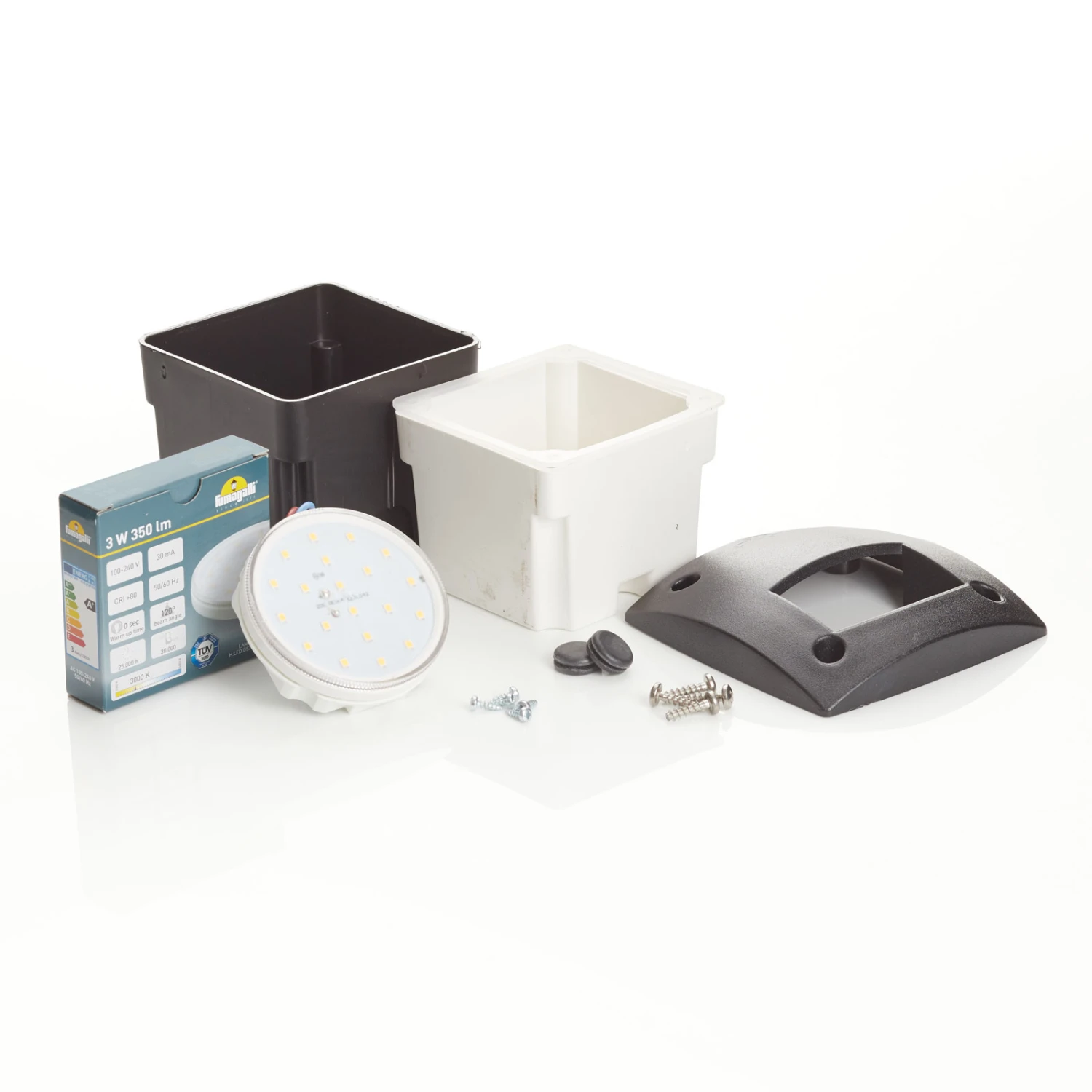 Leti 100 Square-ST ist modern gestaltet. Der schwarze, quadratische Korpus besteht aus Polyresin, der kleine Diffusor aus Polycarbonat. In der Leuchte ist eine GX53-Fassung verbaut, die mit einem LED-Leuchtmittel bestückt ist, das in der Lichtfarbe verstellbar ist – von Warmweiß über Universalweiß bis Tageslicht. Die Wandeinbauleuchte Leti liefert blendfreies Licht für die Fassaden- bzw. Treppenbeleuchtung, z. B. im Bereich des Hauseingangs.