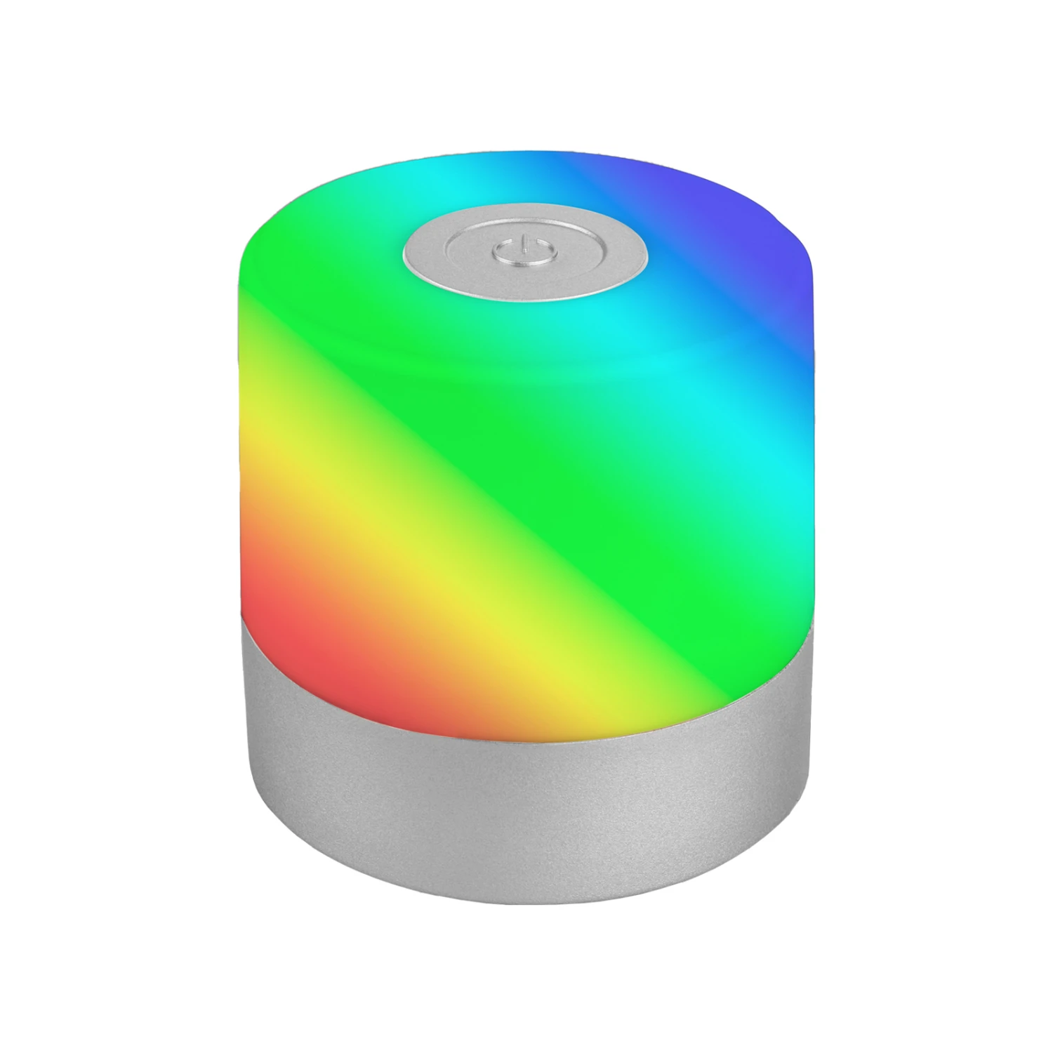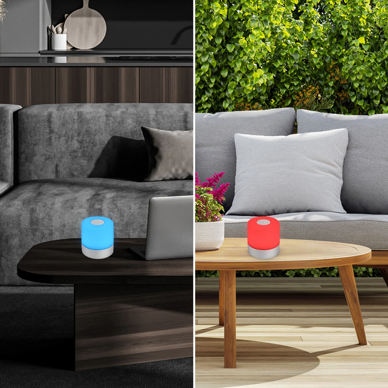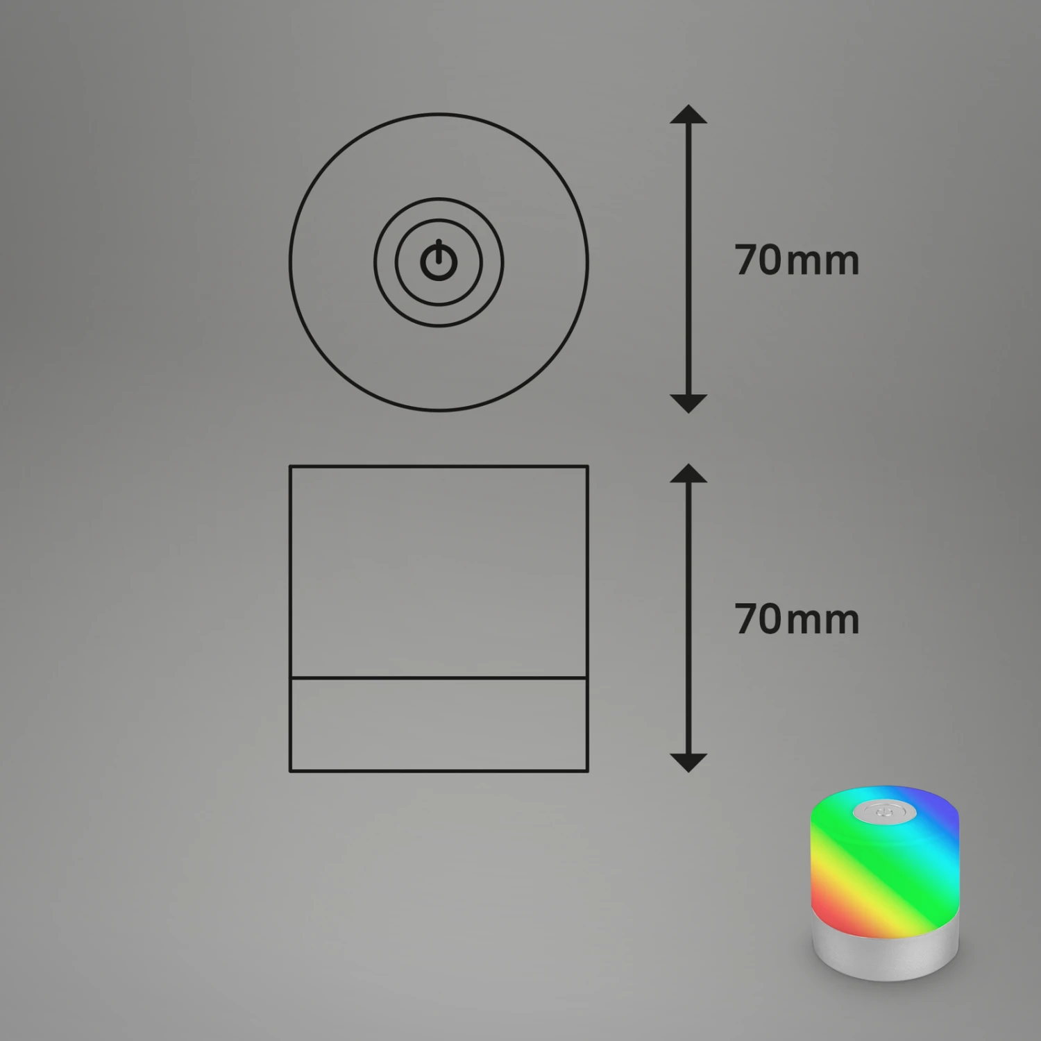 Diese kleine LED-Tischleuchte mit integriertem Akku spendet wahlweise warmweiße oder auch farbige Beleuchtung, und zwar sowohl im Farbwechsel als auch in einer konstanten Farbe. Ein- und ausgeschaltet wird die aus Kunststoff gefertigte Leuchte über den im Boden integrierten Schalter. Per Berührung des Sensorschalters oben auf der Leuchte lässt sich mit einmaliger Berührung warmweißes Licht einstellen, nochmaliges Berührungen schaltet den Farbwechsel ein, die dritte Berührung stoppt den Farbwechsel in der gewünschten Farbe und die vierte Berührung schaltet die Leuchte aus. Im Lieferumfang ist ein USB-Ladekabel ohne Netzstecker bzw. Netzteil zum Aufladen des Akkus enthalten.