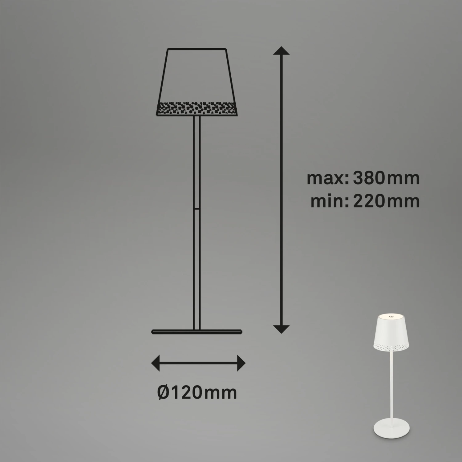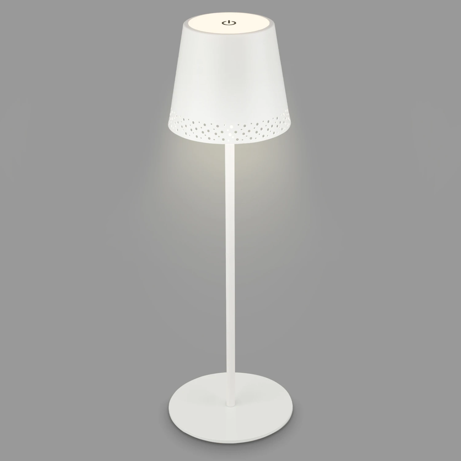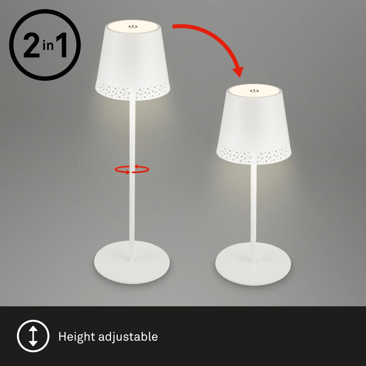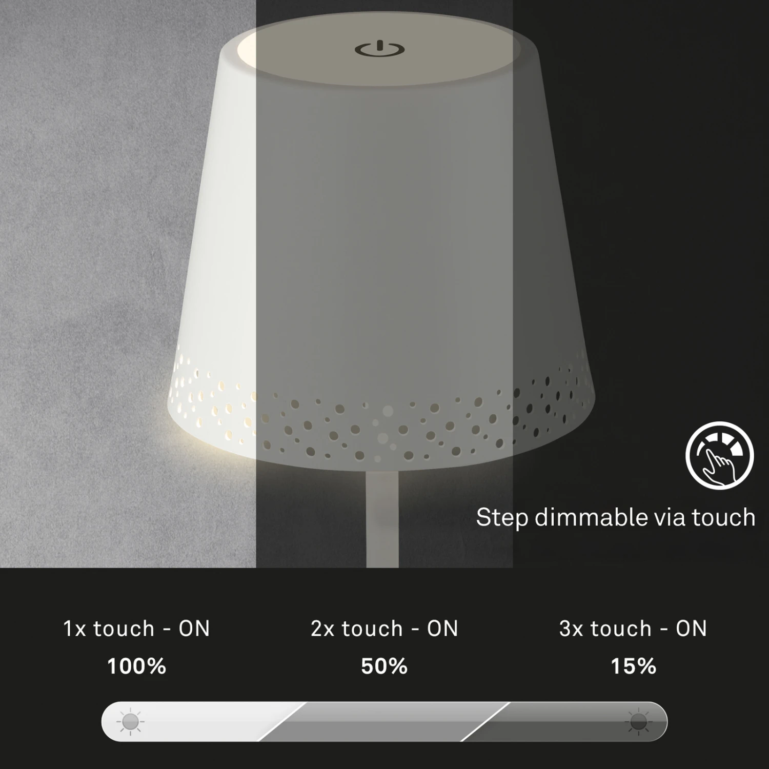 In Innenräumen lässt sich die akkubetriebene LED-Tischleuchte Kiki ebenso nutzen wie dank Schutzart IP44 im Garten oder auf der Terrasse. Die schöne Perforierung mit einem feinen Lochmuster am unteren Rand des Schirms verleiht der Leuchte eine leicht romantische Note, das zweiteilige Gestell mit Schraubverbindungen ermöglicht eine variable Höhe – montiert man eine Stange, ist die Leuchte 22 cm hoch, werden beide Stangen montiert, ist sie 38 cm hoch.