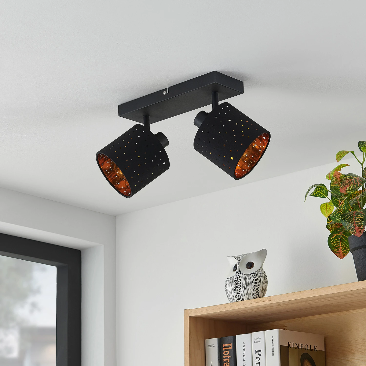 Dieser Strahler überzeugt mit einem modernen und ansprechenden Aussehen. Er verfügt über zwei Stoffschirme in Schwarz, die sich beliebig verstellen lassen und daher gedreht und geschwenkt werden können. An der Innenseite wurde eine dekorative Goldfolie angebracht, die nicht nur schön glänzt und einen Kontrast zu dem markanten Schwarz darstellt, sondern auch ein effektvolles und warmes Lichtbild hervorruft. Außerdem befinden sich in den Schirmen zahlreiche kleine Ausstanzungen, durch die das Licht hindurchfunkelt, als wäre es ein Sternenhimmel, auf den man blickt. Absolut sehenswert und dekorativ – egal, ob man den Strahler an der Decke oder an der Wand montiert.