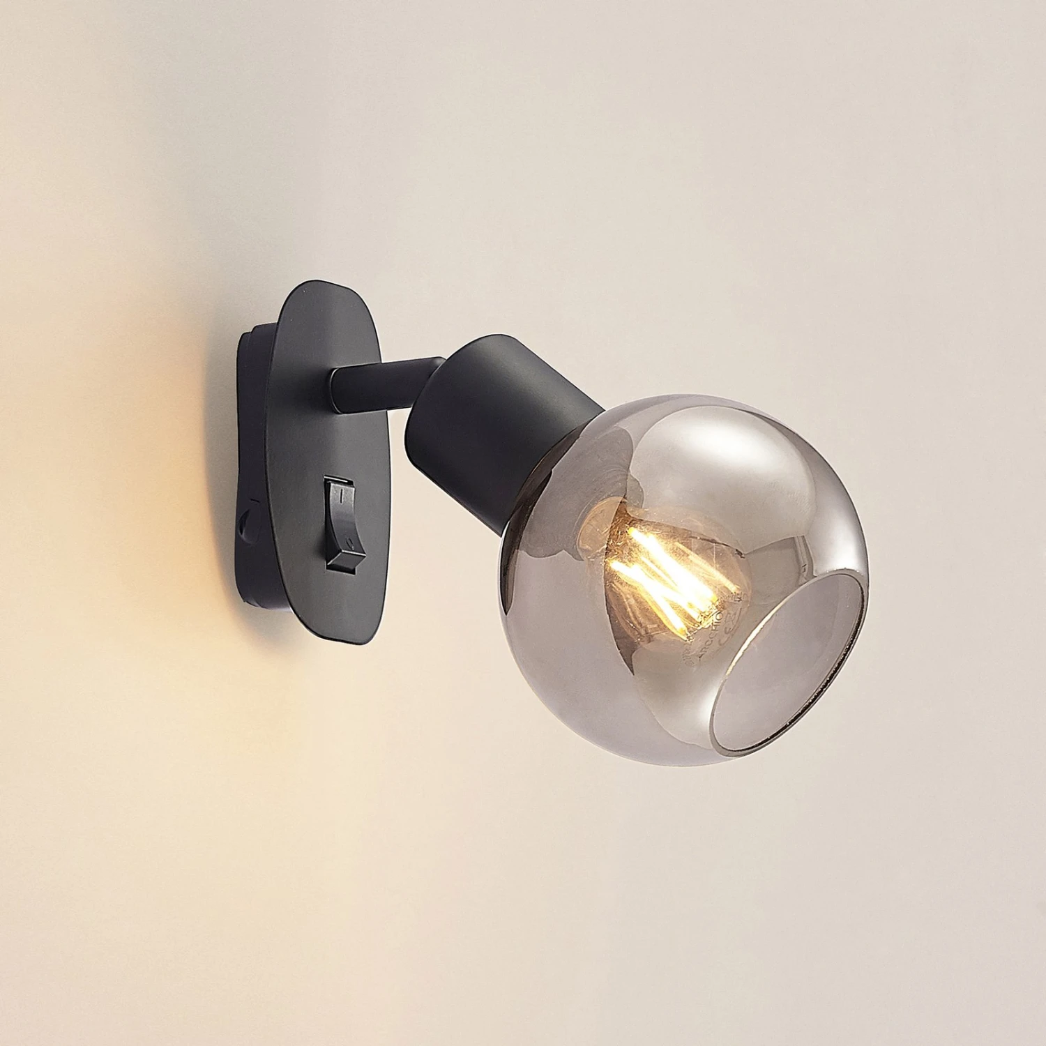 Schwarze Steckdosenleuchte Lioma mit einem Rauchglasschirm