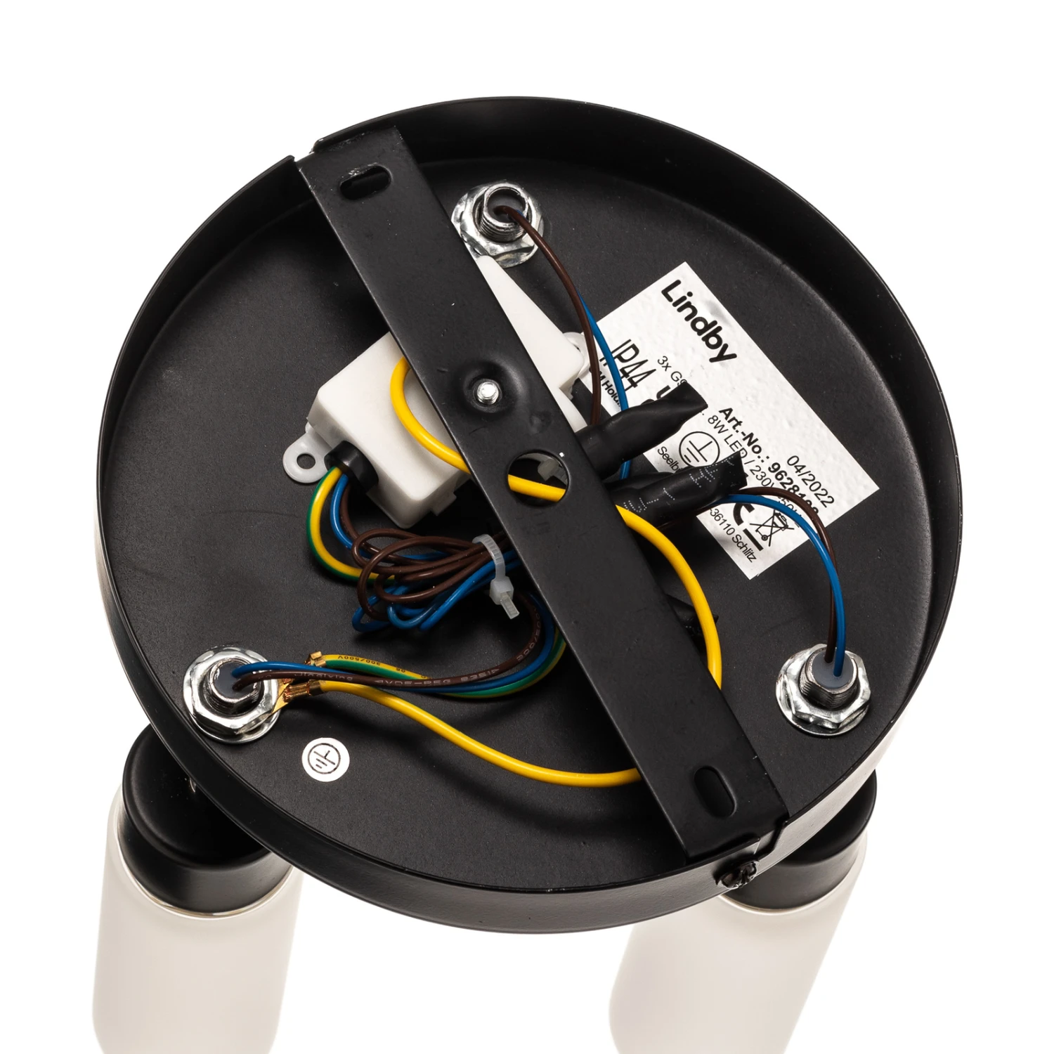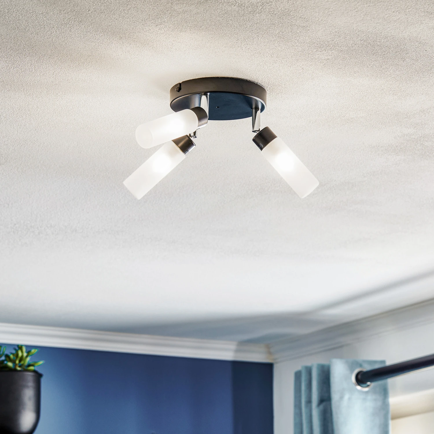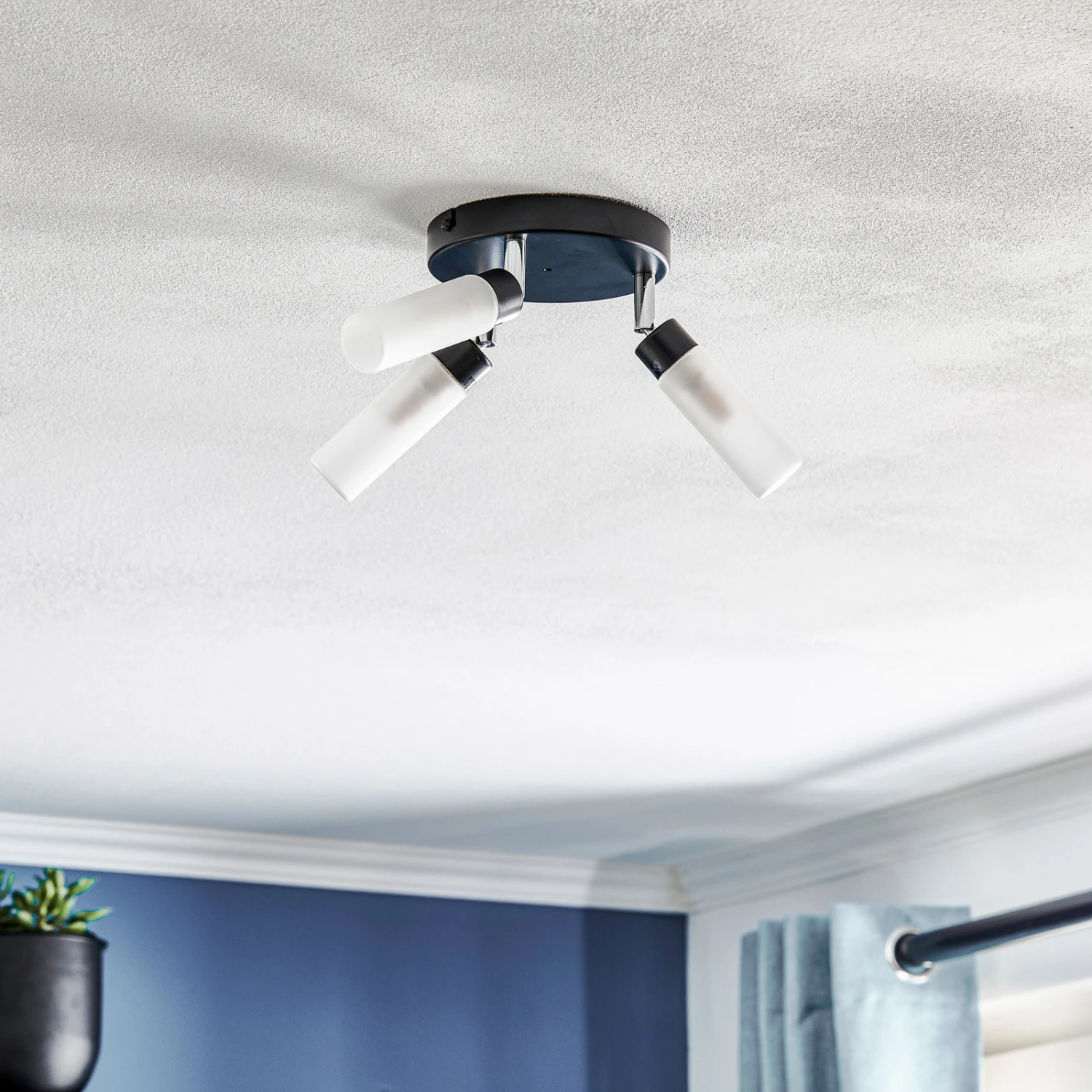 Runder Deckenstrahler Vinza mit drei zylinderförmigen Leuchtenschirmen aus Glas
