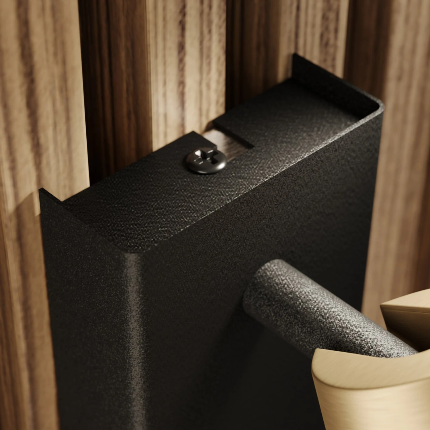 Toller Kontrast im Innenbereich: der Strahler Angelina mit schmalem Lampenschirm in mattem Messing und schwarzer Wandhalterung