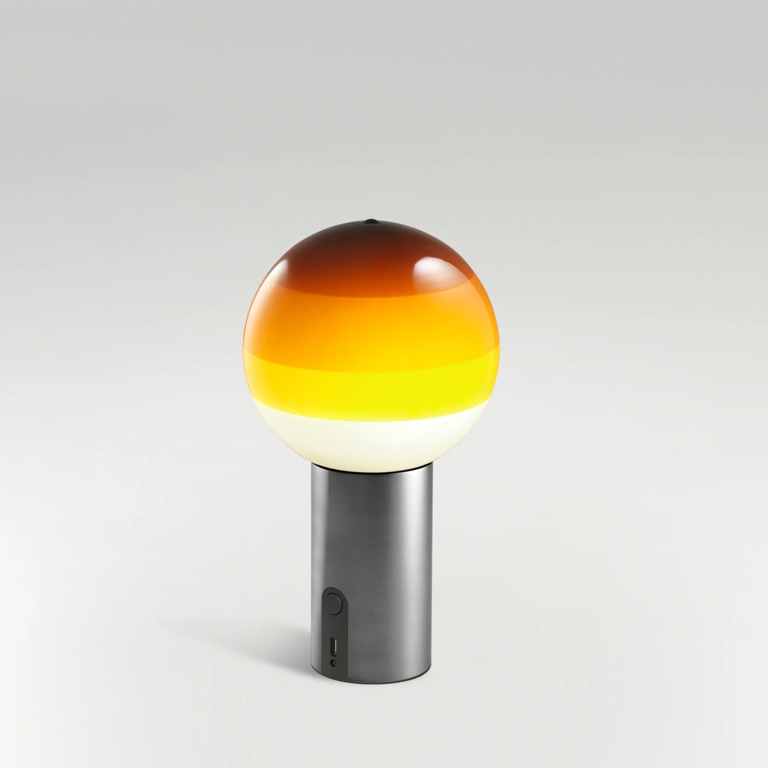 Der zylindrische Metallsockel der LED-Tischleuchte Dipping Light wird von einem glänzend weiß geblasenen und im oberen Teil mit abgestuften Nuancierungen lackierten Leuchtenglas in Kugelform gekrönt. Das besondere Design der von Jordi Canudas geschaffenen Tischleuchte wirkt in jedem Raum modern und belebend. Dipping Light ist für den Betrieb nicht auf eine Steckdose angewiesen, sie ist mit einem wiederaufladbaren Akku bestückt und kann deshalb überall dort platziert werden, wo stimmungsvolles Akzentlicht benötigt wird. Die Leuchtdauer bei voller Akkuladung beträgt ca. 10 Stunden. Ein USB-C-Ladekabel gehört zum Lieferumfang der Leuchte. Ein Steckdosen-Adapter ist nicht inklusive. Über den verbauten Dimmer lässt sich die Helligkeit in drei Stufen variieren.
