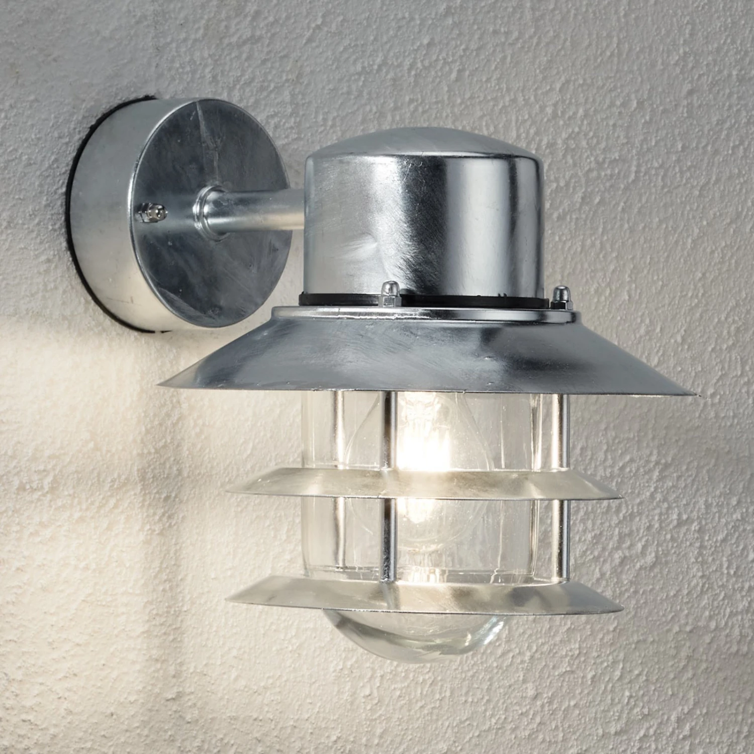 Blockhus ist eine vielseitig einsetzbare Außenwandleuchte, die an unterschiedlich gestalteten Hauswänden gelungen zur Geltung kommt. Sie ist durch die Verwendung von verzinktem Stahlblech ausgesprochen wetterbeständig und zusätzlich mit der Schutzart IP44 ausgestattet. Hinter klarem Glas verbirgt sich das Leuchtmittel, das so für eine helle Ausleuchtung der Umgebung sorgt. So kann die Sicherheit auf dem Grundstück erhöht werden.