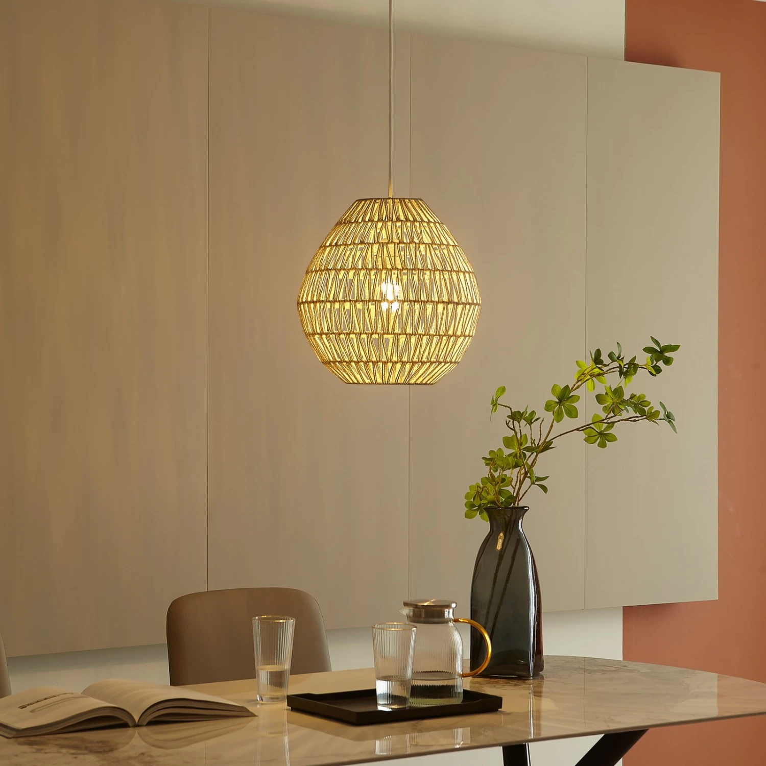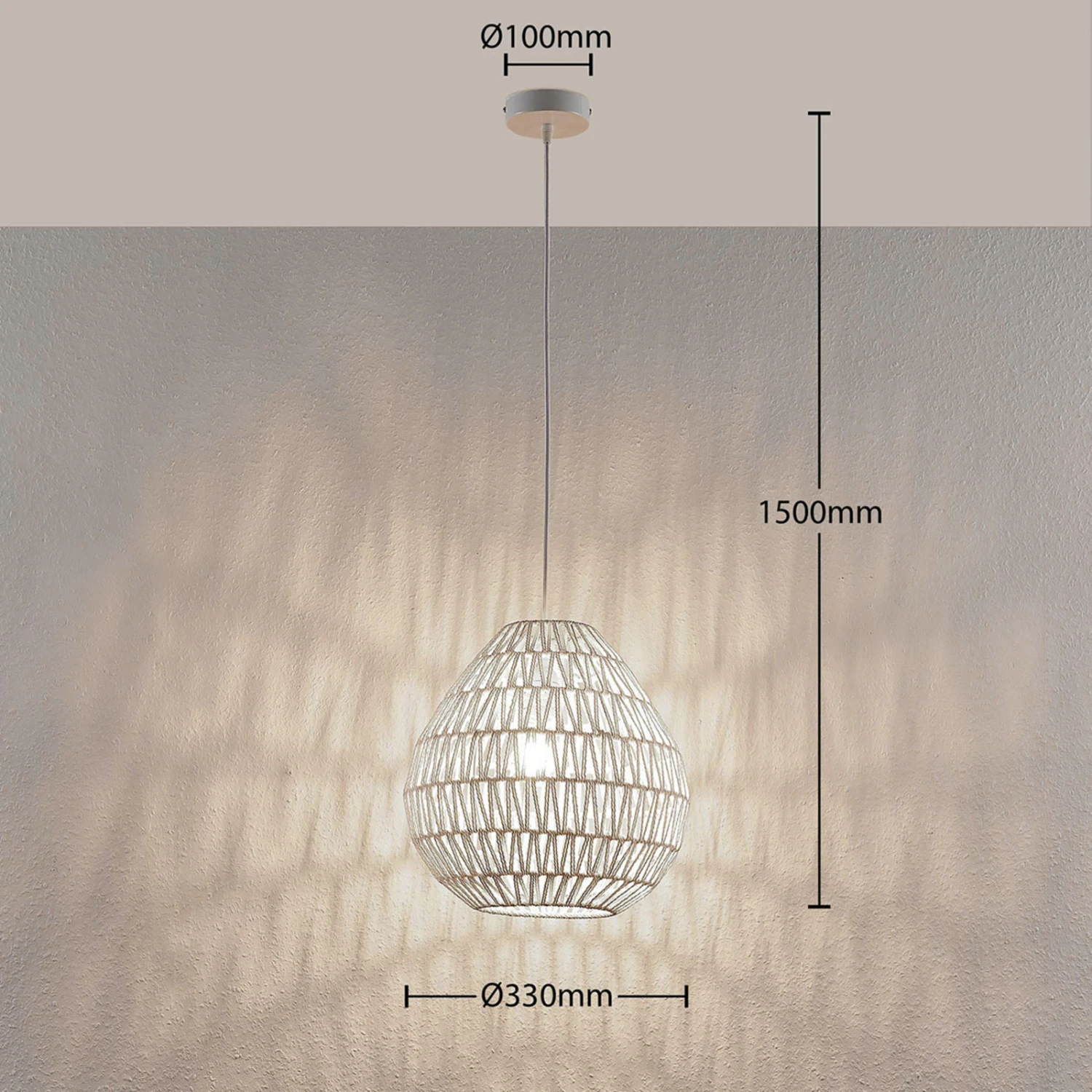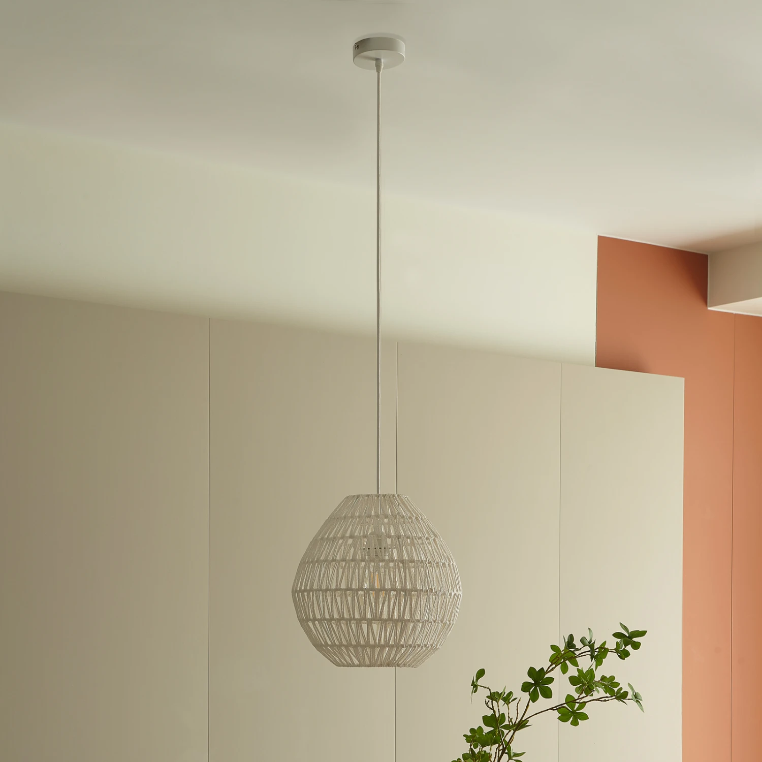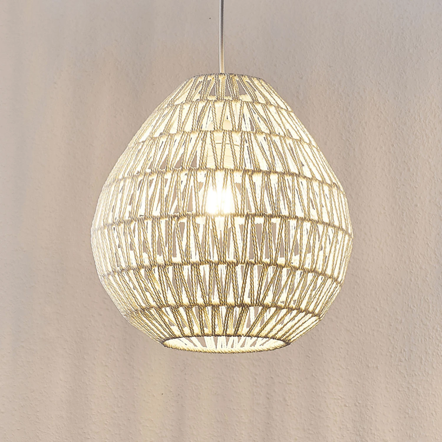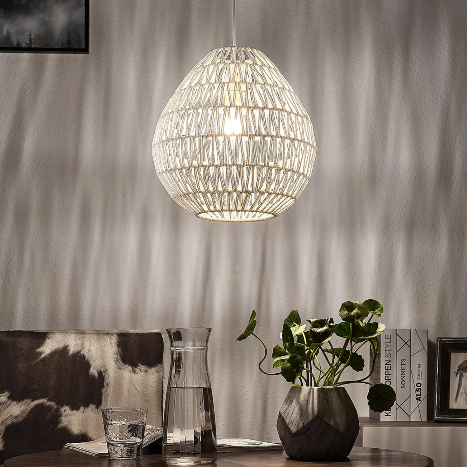 Bauchige Pendellampe Danya mit weißem Geflecht aus eingedrehtem Papier Danya passt wunderbar zu modernen Stilen und zu solchen, wo ein hoher Gemütlichkeitsfaktor vorherrscht und ein stilvolles Design umgesetzt wird, wie zum Beispiel beim skandinavischen Wohnstil. Der bauchig geformte Schirm dieser Pendellampe besteht nämlich aus einem Drahtgestell, das rundherum mit einem weißen Papierkordelgeflecht versehen worden ist, so dass ein kunstvolles Muster entsteht. Durch die schmalen Zwischenräume kann das Licht dann effektvoll und behaglich entweichen, weshalb man die Pendelleuchte Danya sehr schön für die Schlafzimmerbeleuchtung vorsehen kann.