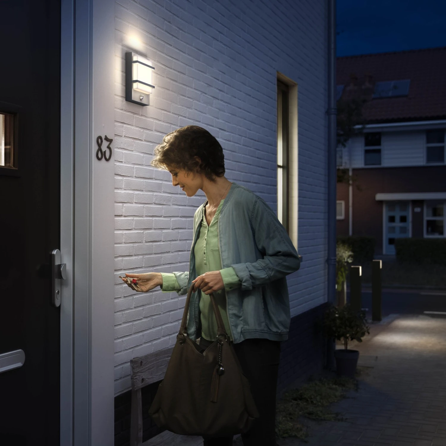 Die kantige Form und das Design mit zwei Streben vor dem opalweißen Diffusor sowie moderne LED-Technik und ein integrierter Bewegungsmelder machen die LED-Außenwandleuchte Petronia zu einer perfekten Lichtquelle für viele Eingangsbereiche. Der integrierte Sensor sorgt für automatisches Einschalten des Lichts.