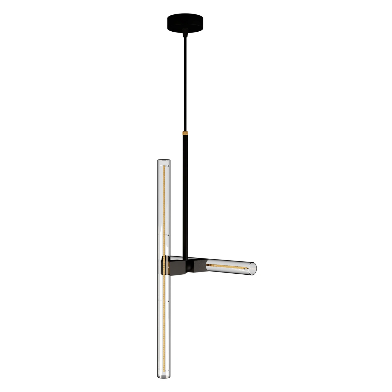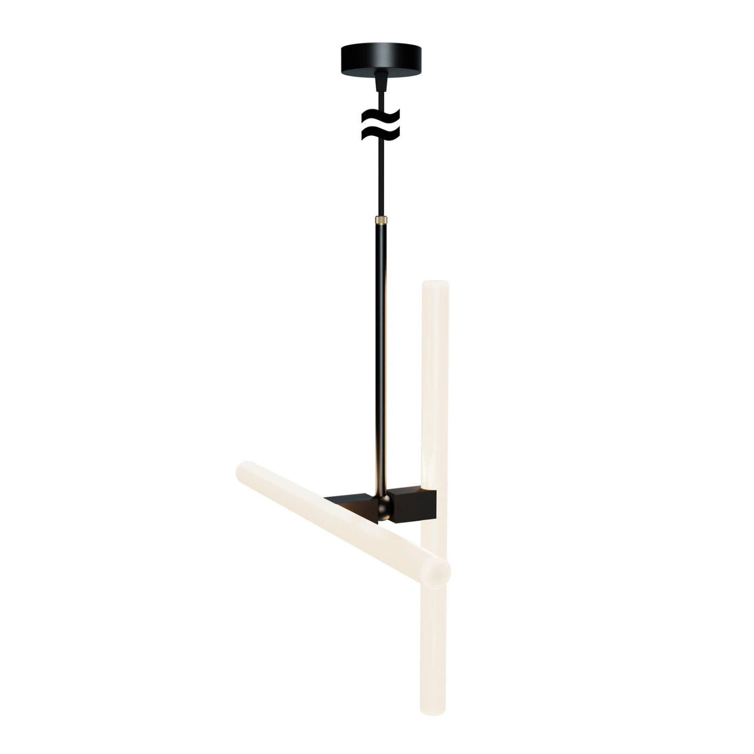 An einer schwarzen Abhängung, die teils aus dem Kabel und im unteren Teil aus einer Stahlstange besteht, sitzen bei der Hängeleuchte Axis zwei S14d-Fassungen. Ihr Design stellt ein Koordinatensystem aus Licht dar; die rechtwinklig zueinander stehenden Linienlampen bilden die X- und Y-Achse, die schwebend beispielsweise über einem Tisch hängen. Die Leuchtmittel sind nicht im Lieferumfang enthalten, so dass die Wahl der S14d Linienlampen auf verschiedene Längen und verschiedene Oberflächen fallen kann, je nach persönlichem Geschmack und gewünschter Lichtwirkung.
