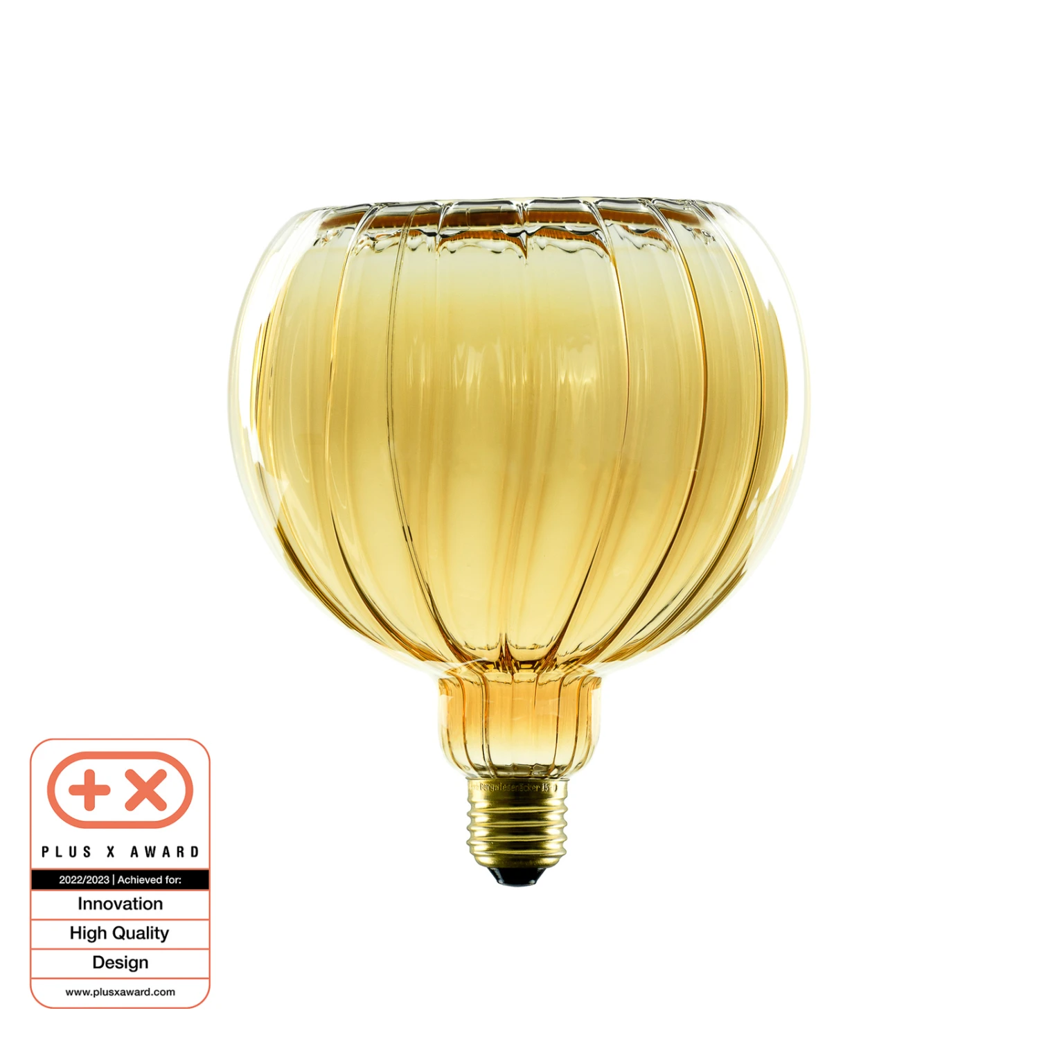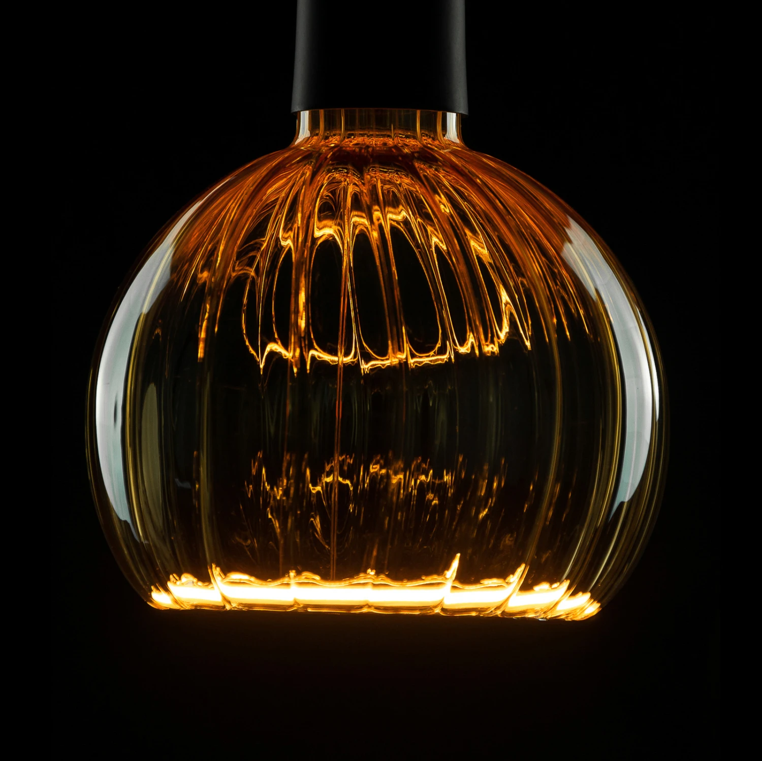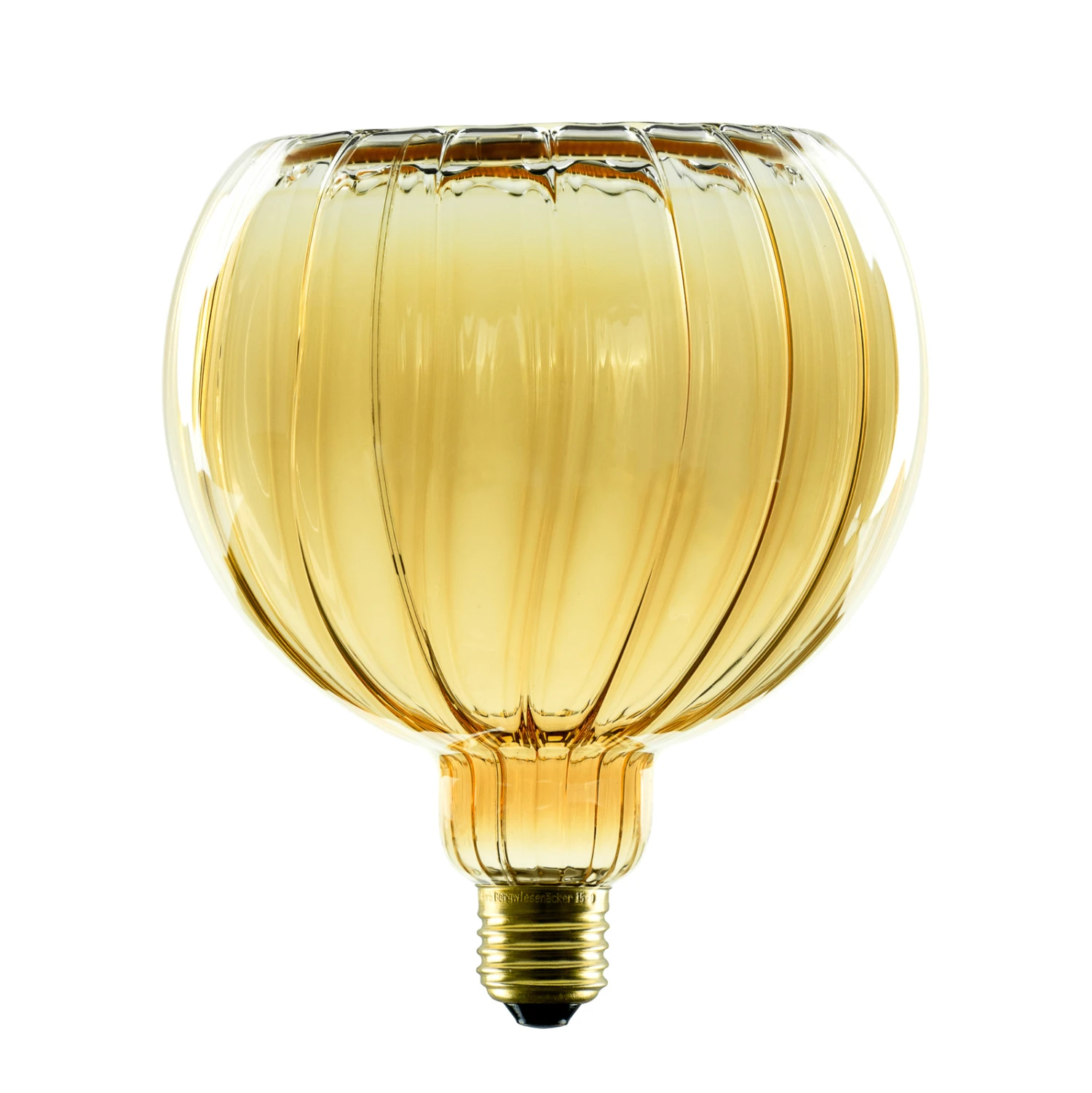 Die große LED-Floating-Globelampe verfügt über ein goldgetöntes Glas mit vertikal verlaufenden Streifen an der Außenseite. Durch die warme Farbe des Glases entsteht eine gemütliche Note im Wohnbereich. Die LED-Globelampe eignet sich wunderbar für die Nutzung in offen gestalteten Leuchten, beispielsweise Hängeleuchte ohne Schirm. Die Helligkeit lässt sich mit einem kompatiblen externen Phasendimmer regulieren.