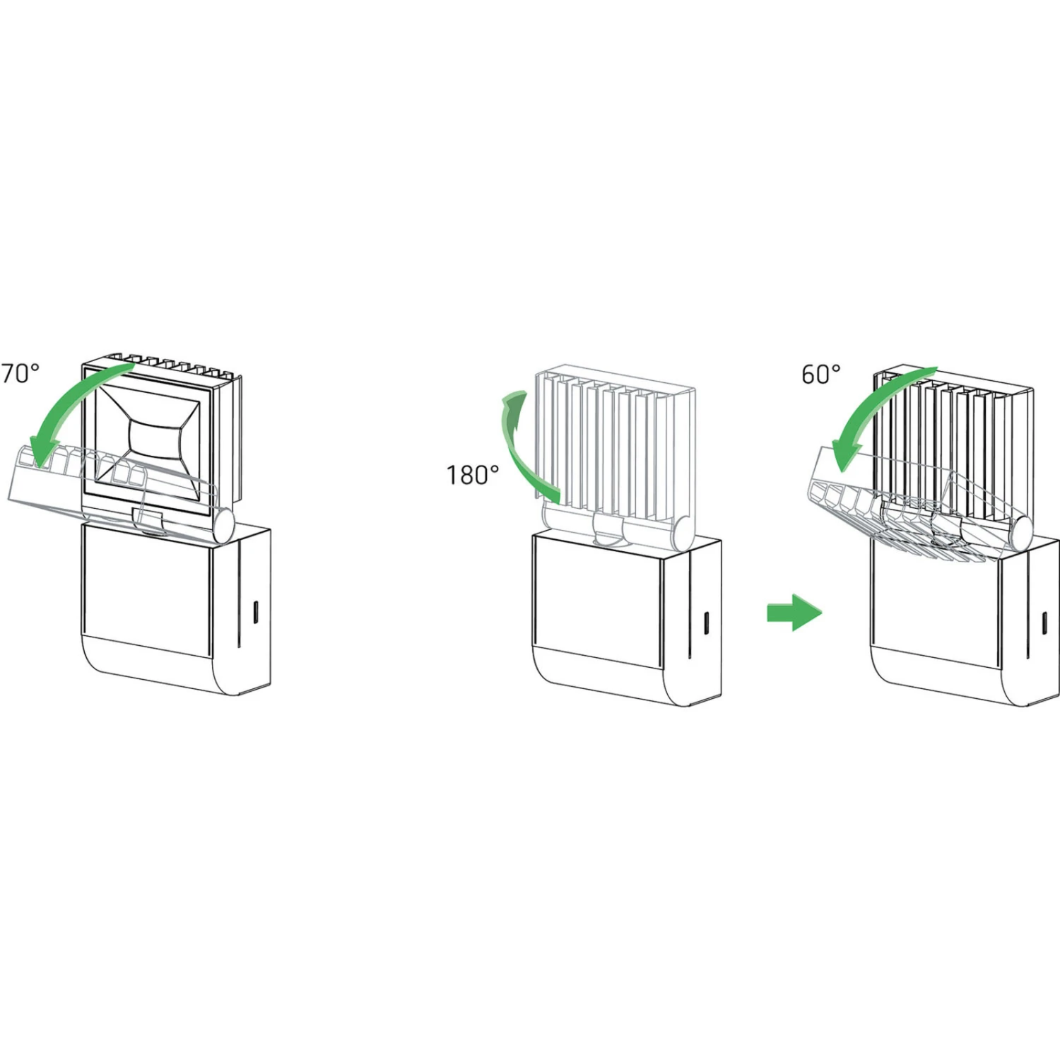Der LED-Außenstrahler theLeda S10L ist mit einer leistungsstarken LED-Lichtquelle bestückt, die mit intensivem, universalweißem Licht die Umgebung hell und sicher ausleuchtet. Der dreh- und schwenkbare Strahlerkopf gewährt eine umfassende Ausleuchtung sowohl zu den Seiten (± 40°) als auch nach unten (70°). Auch eine Drehung um 180 Grad für das Anstrahlen der Wand ist möglich.